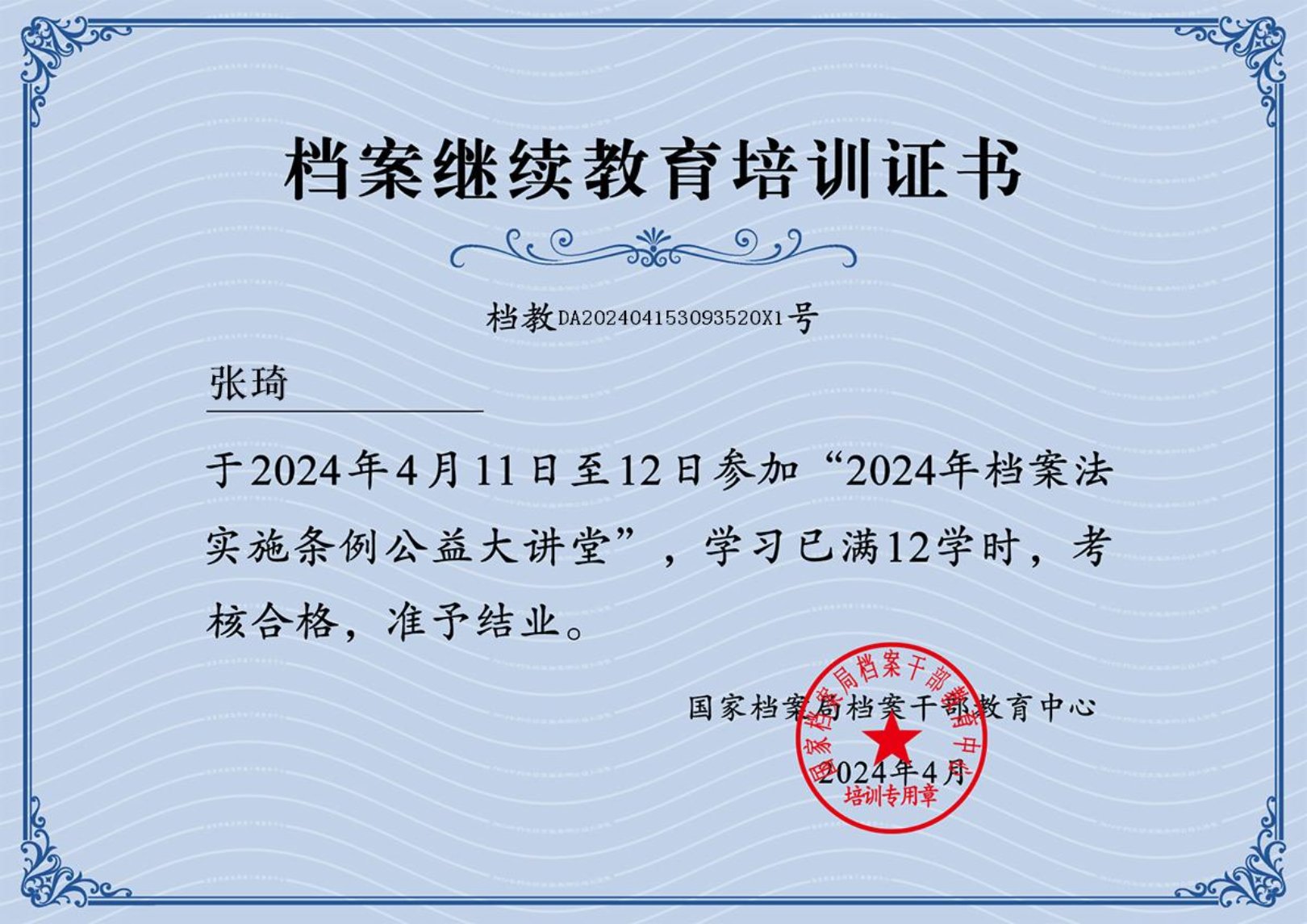 期间,先后深入学习贯彻《实施条例》、《实施条例》档案信息化建设专章解读等内容。通过系列专题讲座,进一步了解了档案事业法治建设历程和档案事业的高质量发展。本次培训共计 12学时,兼职档案员在教学平台按时完成了学习并通过考试取得电子培训证书。
