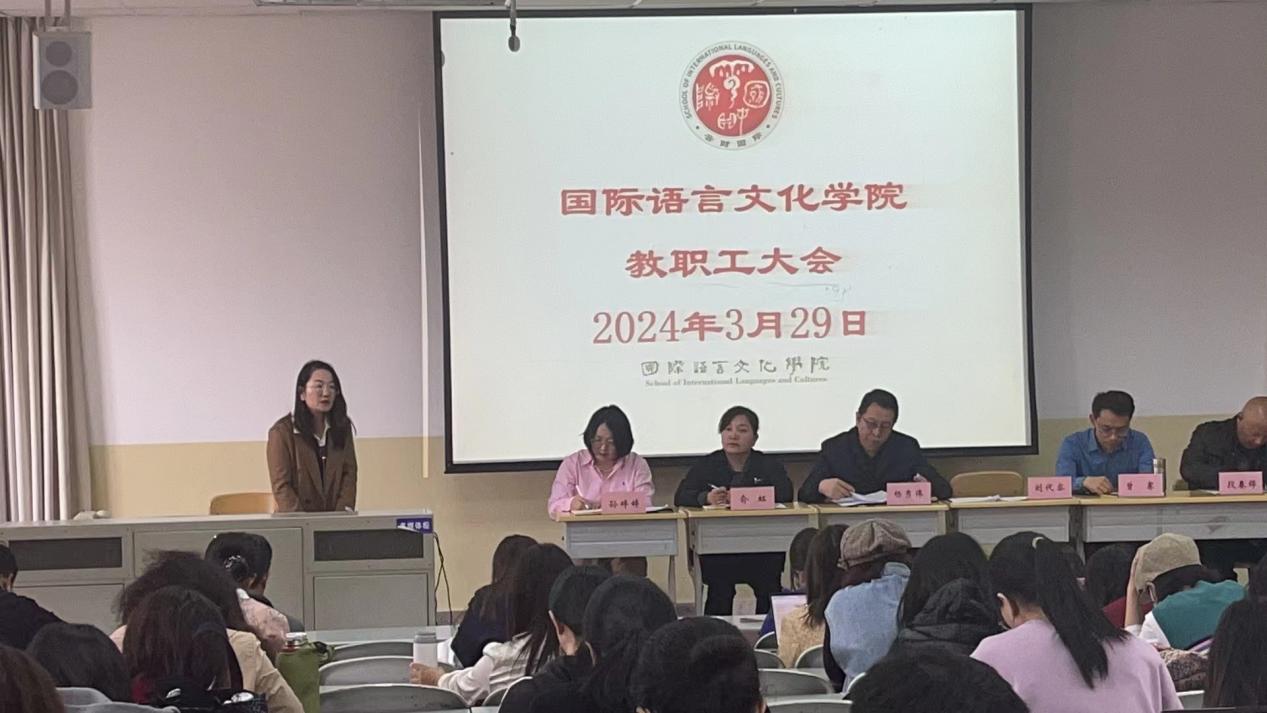 3月29日,在学院教工大会上,学院主要领导结合教学工作相继传达了本科教育教学审核评估工作近期任务及要求。刘代容院长传达了“第十三届全国大学英语院长/系主任高级论坛”和“第八届全国高等学校外语教育改革与发展高端论坛”会议要点,就当前公共外语教育及外语专业的数字化建设、产学研合作、理解当代中国系列教材使用等问题做了交流,希望学院教师积极开展教研教改,打造教学团队,共同提升育人质量。孙婷婷副院长讲解了学院“精彩一课”方案,对近期开展的试卷检查、撰写本科教育教学审核评估自评自建报告等相关工作向全院教师做了汇报。通报了学校论文抽检情况并对学院2024年论文检测工作要求做了说明。杨秀伟书记强调今年是学校教学质量提升年,根据迎评工作动员及工作要求,杨秀伟书记提出两点要求:一是要提高认识,推动评估工作;二是要主动作为,树立大局意识。