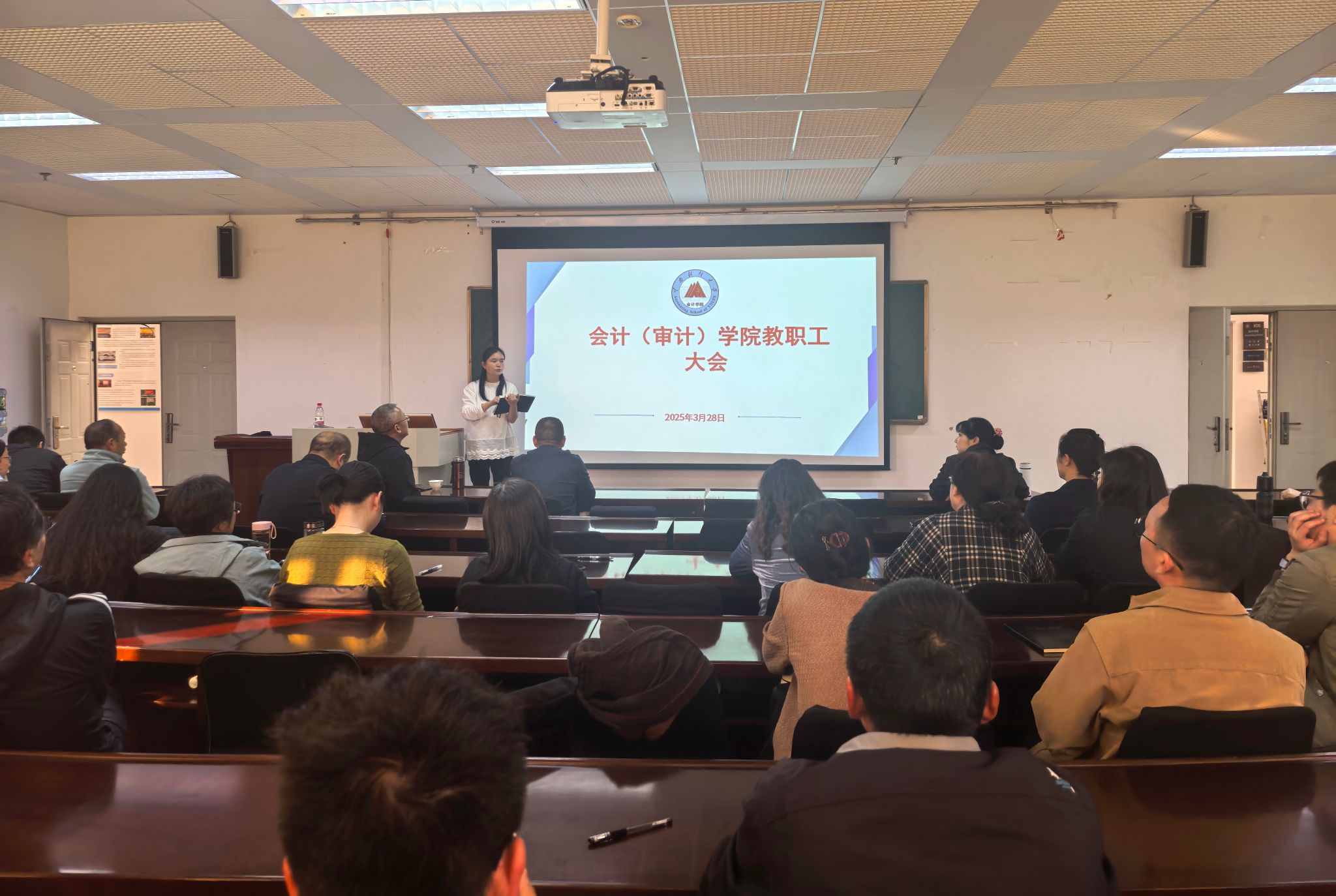 3月28日,会计(审计)学院在逸夫楼804召开全体教职工会议,传达学习学校2024-2025学年春季学期现场集体巡课工作会精神和相关要求。会议由教学副院长胡耀丹主持。