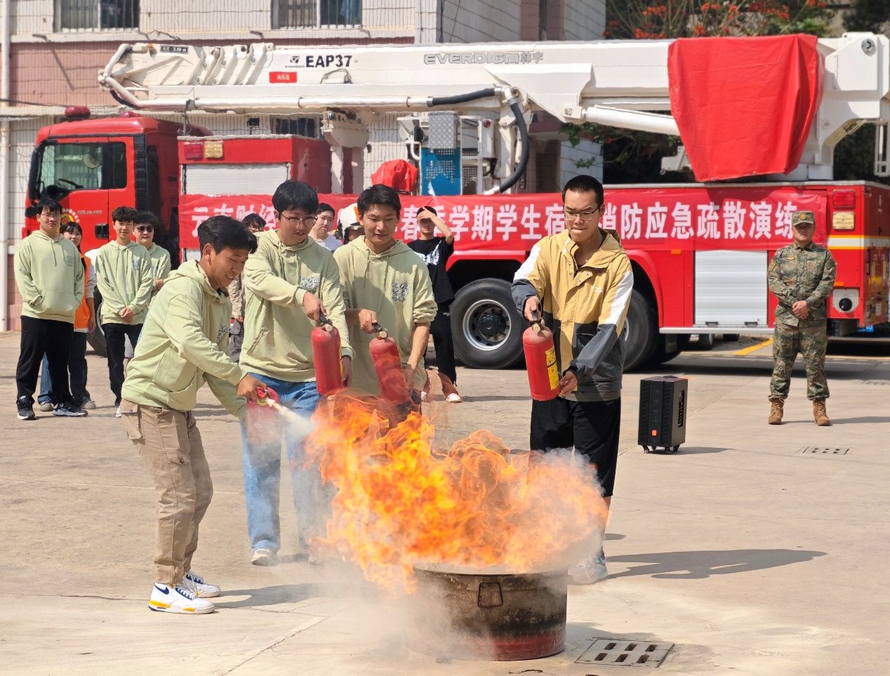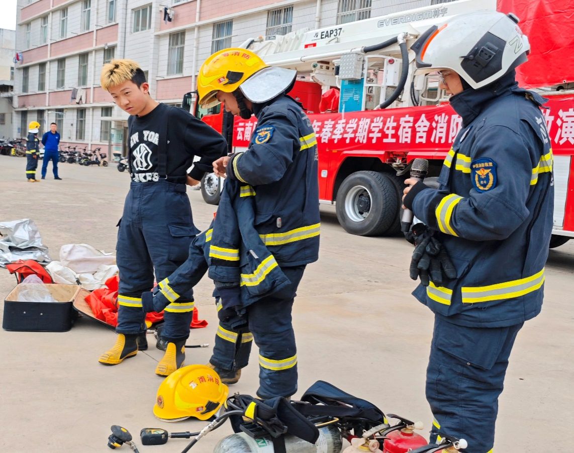 五华区消防救援大队教员对消防器材装备、学生宿舍防火及疏散要点、消防安全“四个能力”建设、常见灭火器材操作使用方法等进行了细致的讲解和展示,还邀请师生现场体验了消防战斗服、扑救初起火灾实操和乘坐云梯消防车等实践。