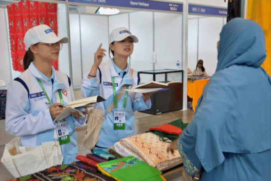 During the expo, YUFE volunteers were responsible for sales statistics, language services, and satisfaction surveys across nine exhibition halls. The students dedicated themselves to their roles with enthusiasm each day—some moved between booths to track the number of businesses from various countries and recorded specific sales data; others provided written and oral translation support for exhibitors from South Asia, Southeast Asia, and other countries, facilitating efficient communication with guests and visitors to ensure smooth transactions; while some conducted surveys in various halls to gather timely feedback.