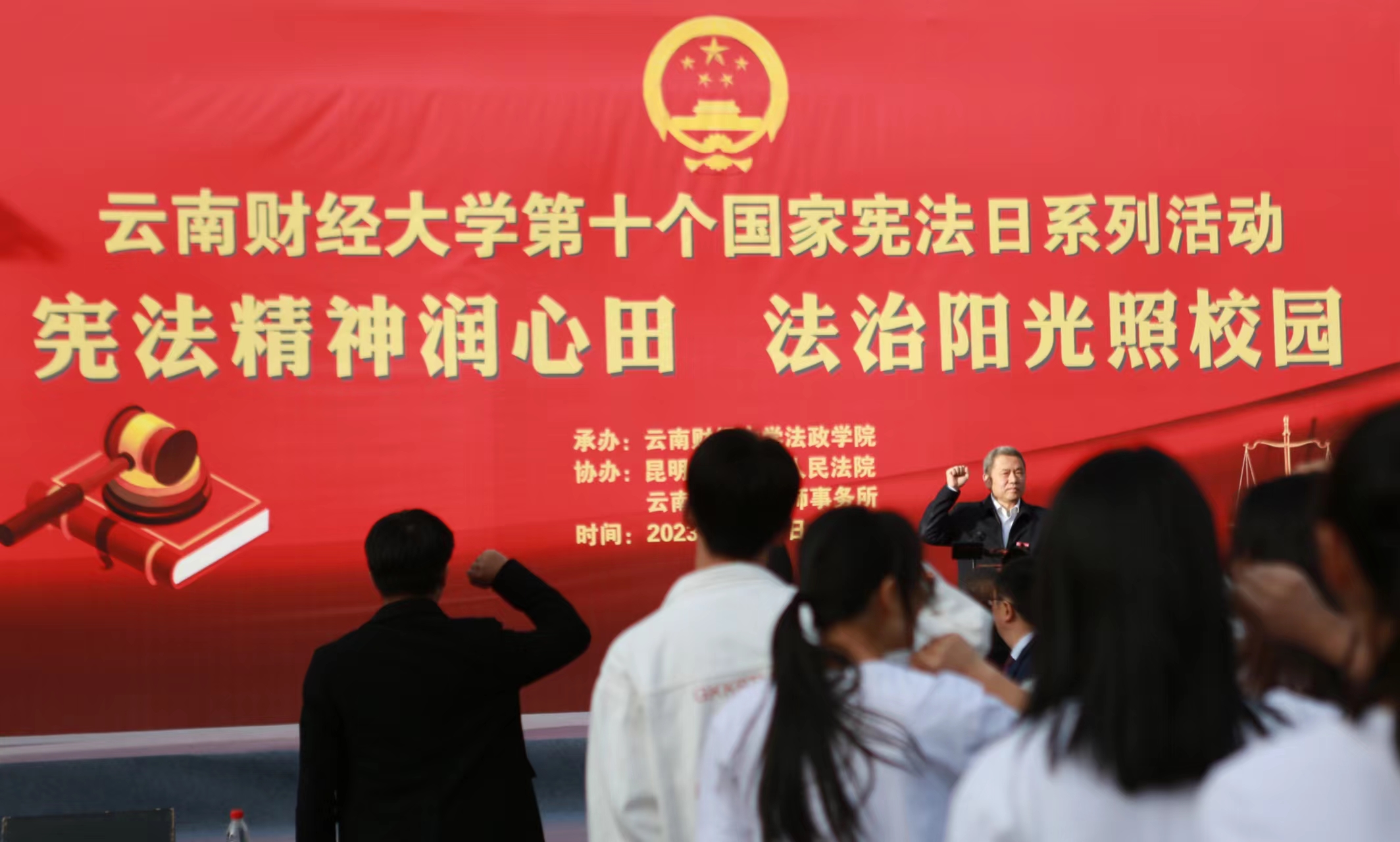 2023年12月4日下午,由学校主办、法政学院承办的主题为“宪法精神润心田,法治阳光照校园”的第十个国家宪法日系列活动在南院博源广场隆重举行。
