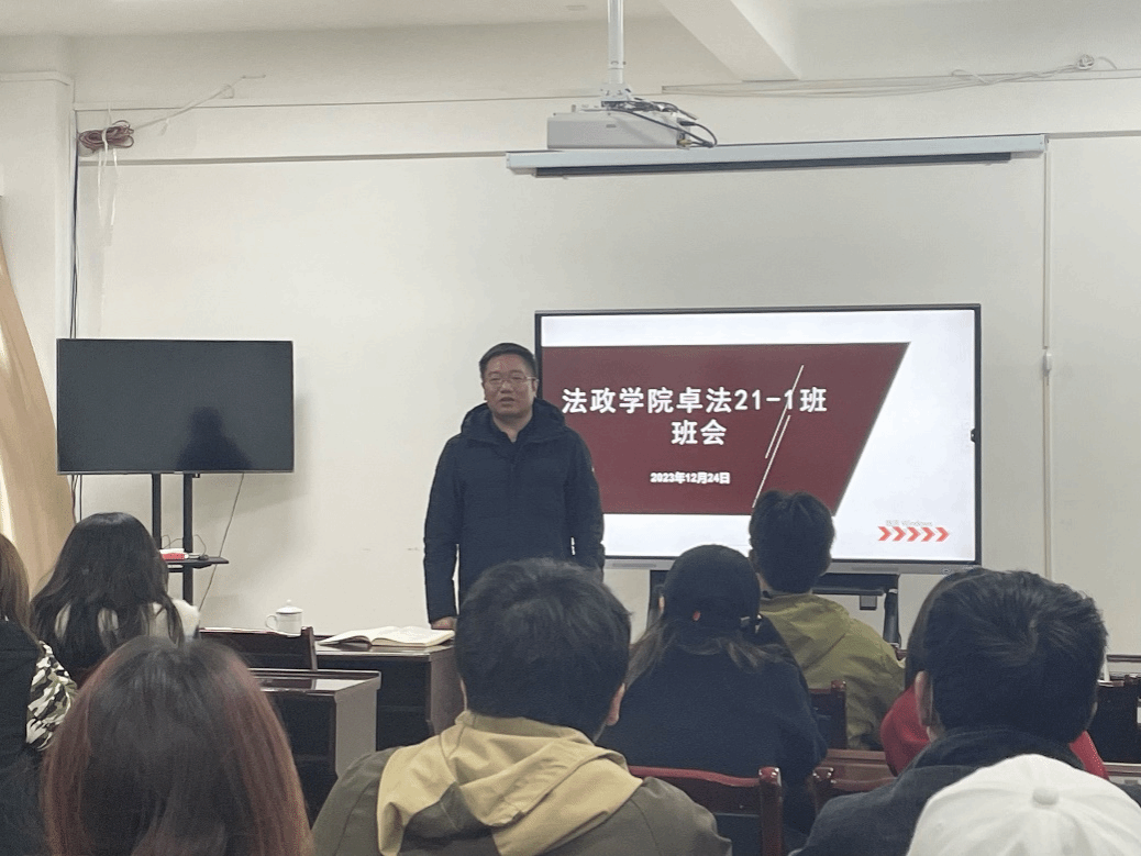 2023年12月24日,法政学院各班级以主题班会的形式专题学习了习近平总书记在中共中央政治局第十次学习时关于涉外法制建设的重要讲话精神。beat365英国官方网站校党委委员、纪委书记、监察专员业光远,法政学院党委副书记、纪委书记张吟竹参加了卓法21-1班班会。