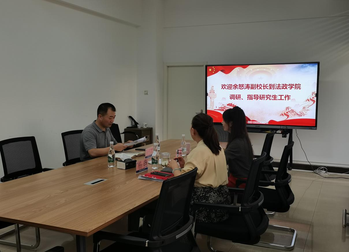 为深入开展学习贯彻习近平新时代中国特色社会主义思想主题教育,持续用习近平新时代中国特色社会主义思想和党的二十大精神武装头脑、指导实践、推动工作,2023年6月26日,余怒涛副校长到法政学院调研研究生管理相关制度文件,指导研究生培养质量工作。法政学院副院长马慧娟,研究生科科长杨艳参加了此次调研。马慧娟副院长首先介绍了法政学院建院以来,各硕士专业点的设立、建设情况;包括研究生招生的生源情况;研究生培养管理过程中的制度完善和发展情况。汇报了法政学院教职工队伍现状,硕士研究生导师队伍状况和研究生管理过程中存在的问题。报告了2023年研究生工作规划等情况。
