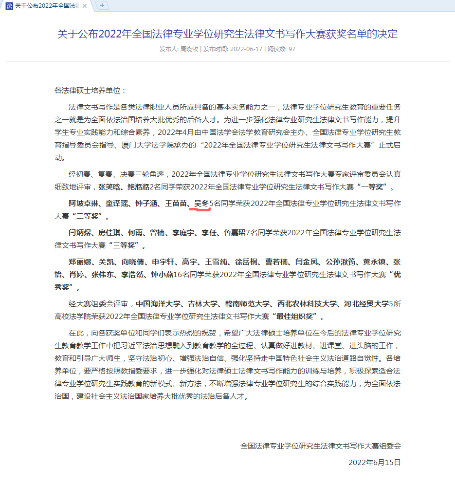 初赛共吸引了来自全国200个法律硕士培养单位共计3659名法律硕士研究生参加。经过初赛、复赛两轮选拔,来自28个培养单位的30名法律硕士研究生进入决赛。6月11日,决赛最终角逐出一等奖2名,二等奖5名,三等奖7名,优秀奖16名。法学院2020级研究生吴冬同学经过近两个月的拼搏努力,从众多参赛者中脱颖而出闯入决赛,并以优异成绩斩获二等奖。