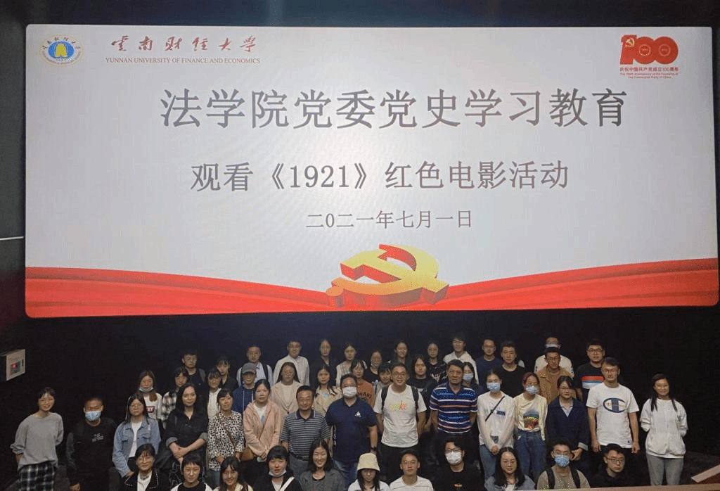 为庆祝中国共产党成立100周年,丰富党史学习教育的形式,2021 年7月1日,法学院组织全体师生党员50余人集体观看献礼建党一百周年影片《1921》。