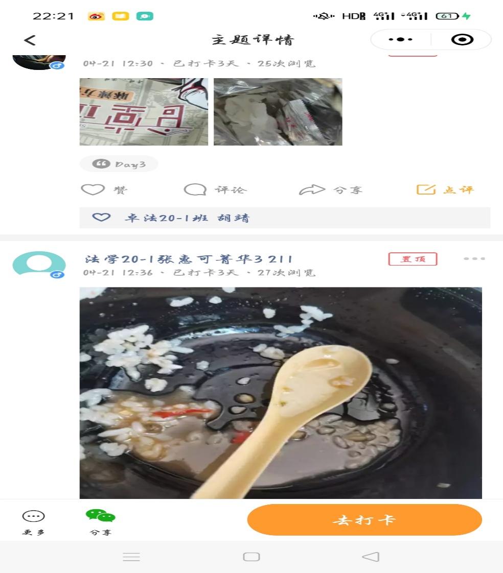 为期7天的打卡里,同学们都十分认真的按要求操作,没有出现代打、假打等恶劣行为。同学们在打卡小圈子里抒发着自己想法,表达爱惜粮食的必要性。朱琪琪同学表示,青年大学生要努力动手实践,节约生活中的一点一滴,杜绝浪费恶习。霍瞳瞳同学说:“一粥一饭,当思来之不易;半丝半缕,恒念物力维艰。艰苦奋斗,勤俭节约的思想永不能忘。”陆盈如同学表示,应该要在全社会倡导浪费可耻、节约为荣的理念,发扬勤俭节约的传统美德......