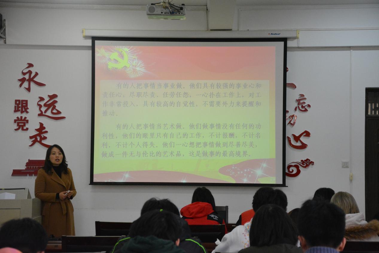 李姗姗首先向同学们介绍加强作风建设的重要性,作风建设事关一个政权、一个国家的存亡绝续、长治久安,事关一个组织、一项事业的荣辱成败、兴旺发达,事关一个人、一个家庭的健康快乐、幸福和谐。加强作风建设,避免腐化堕落,是古今中外成大事者夺取政权、保持政权、巩固政权的必由之路。这也是我们共产党人“鉴前世之兴衰,考当今之得失”得出的基本历史结论。学生骨干也应加强作风建设,每一个骨干都要做好自我监督,端正态度,树立大局观和责任感,关心同学,服务同学,同时培养自己的羞耻心、知足心、感恩心、事业心、责任心、敬畏心,做到自我充实,自我完善。