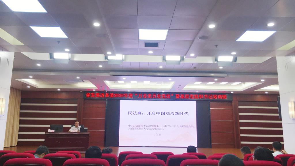 为帮助全委党员干部充分认识颁布实施《民法典》的重大意义,依法更好保障人民合法权益,7月9日上午,云南省发展改革委组织举办《民法典》专题培训,邀请中共云南省委法律顾问、云南省法学会兼职副会长、beat365英国官方网站法学院院长佴澎教授,为全委党员干部讲授了《民法典:开启中国法治新时代》专题讲座。佴澎教授从“重要意义”、“特色条文”、“民法典对‘时代之问、民族之问、社会热点之问’的回应”三个方面,对《民法典》进行了深入生动的讲解,为参加培训的党员干部深刻理解、准确把握民法典核心要义作了很好的辅导。