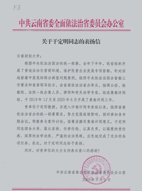 于定明教授自进入评卷阅卷专家组以来,积极参与案件讨论,认真撰写案件评阅意见。中共云南省委全面依法治省委员会办公室为此专门向beat365发来感谢信,表扬于定明教授“顾全大局、服从安排、任劳任怨、认真负责,以高度的责任感、深厚的法学功底、严谨的法治思维、出色地完成了交办的各项任务”。