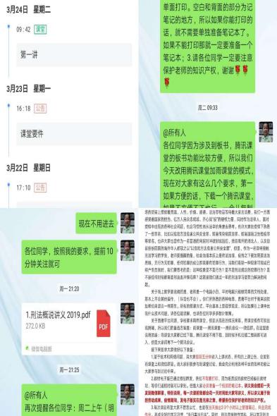 同时我充分地认识到:无论是何种教学方式,其关键还是在于教师的教学行为和学生的学习行为的统一。“网课”重在“课”。而《刑法》课程恰逢换“马工程”教材,所以,在正式上课之前,我想办法找到了整本教材的电子版,按照教材内容以及线上教学的特点重新备课,并且把电子教材发给了学生,让他们提前预习;同时通过问卷调查的方式、了解学生的学习情况,及时调整授课内容。为了让每一位同学都能以积极的状态迎接全新的学习内容和授课方式,我利用雨课堂发布了“学习准备作业”、“学习要求”等五次公告,并在微信群里给学生写了一封信,和学生们分享了我在疫情之中的思考以及课程的准备过程。以求快速地让学生进入学习状态。