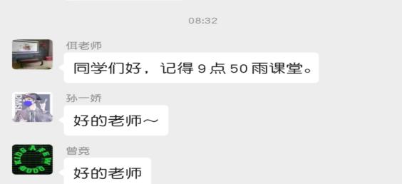 带着这样的担忧,beat365英国官方网站法学院院长佴澎老师开始了他在雨课堂上的第一次授课,考虑到各位同学也是第一次接受这样的线上授课方式,佴老师上课当天就早早的在班级群中通知各位同学记得上课时间,不要迟到,同学们也纷纷回应老师。