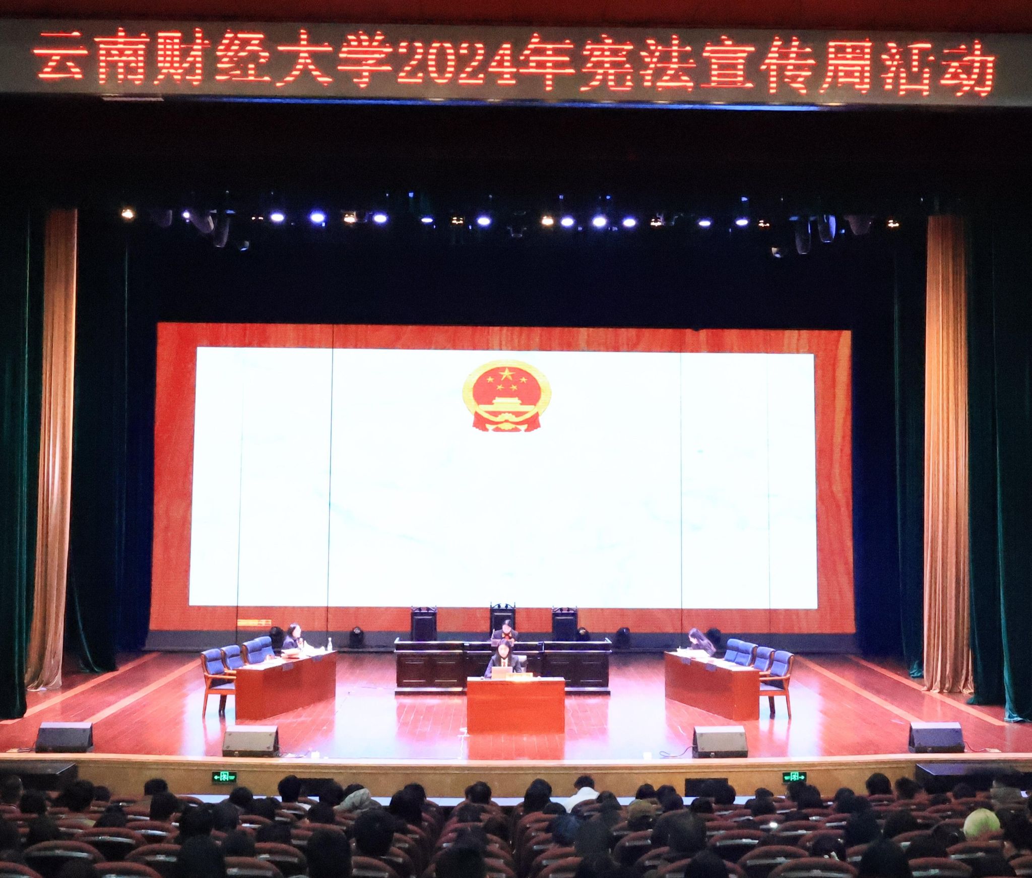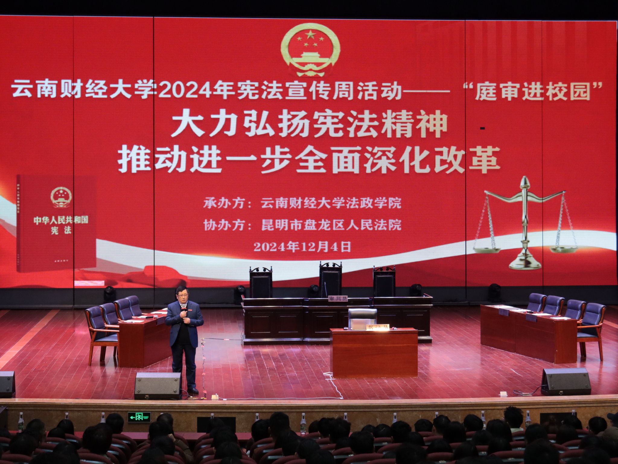 在2024年12月4日“国家宪法日”,法政学院于2024年12月4日在beat365英国官方网站汇文礼堂举办“宪法宣传周”—‘真实庭审进校园’活动。本次活动由法政学院承办、盘龙区人民法院协办,法政学院院长石现明、党委副书记张吟竹、副院长简琨益、盘龙区法院法官和书记员,beat365英国官方网站师生400余人参加。
