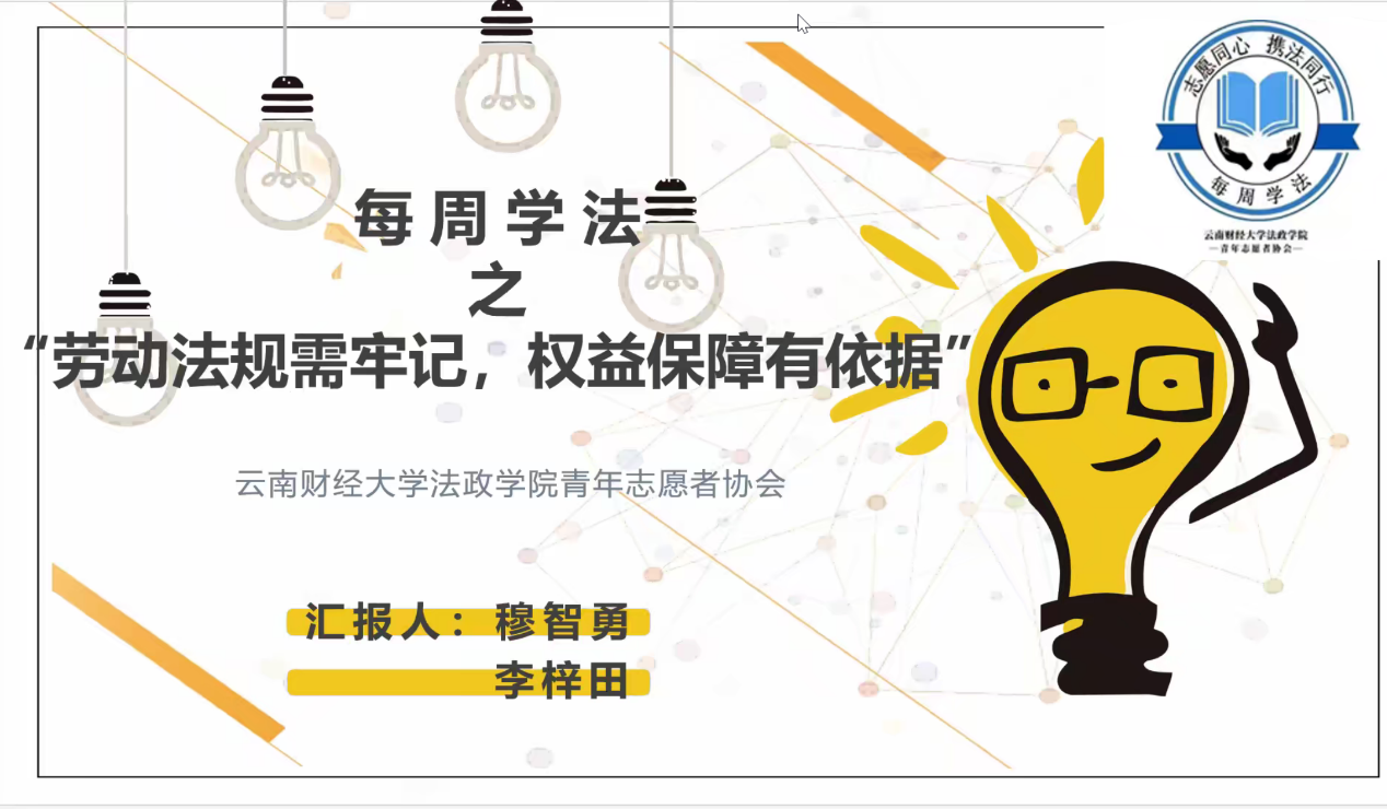 本次活动通过腾讯会议面向全校师生开展。志愿者向云财学子介绍了劳动者合法权益的内容,让云财学子对劳动者的合法权益有了初步认识。随后,通过援引经典案例来为同学们讲解相关劳动法规的规定和要求。最后,通过现场讲解、互动问答等方式,进一步增强云财学子的法治意识。
