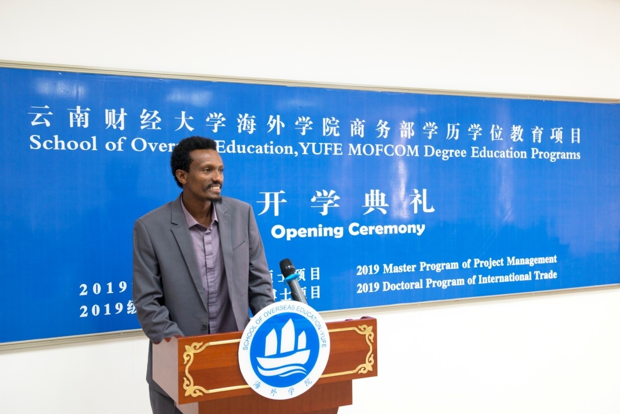 之后,2019级埃塞俄比亚博士学员代表ABOYE TILAHUN ABERA代表2019级全体新生致辞。他表示,取得攻读博士学位的机会不容易,非常具有挑战性,但所付出的一切努力都是值得的。读博士的原因不是简单的把自己的称谓从先生变为博士,而是为了推动研究,成为相关领域的专家。感谢这个项目为所有学员提供一个交流学习的机会,使大家能够分享彼此的文化,使这个世界成为一个地球村。通过在云南财大学习,大家不仅能够建立深厚的友谊,还能为各自国家建立和保持双边贸易和商业关系。