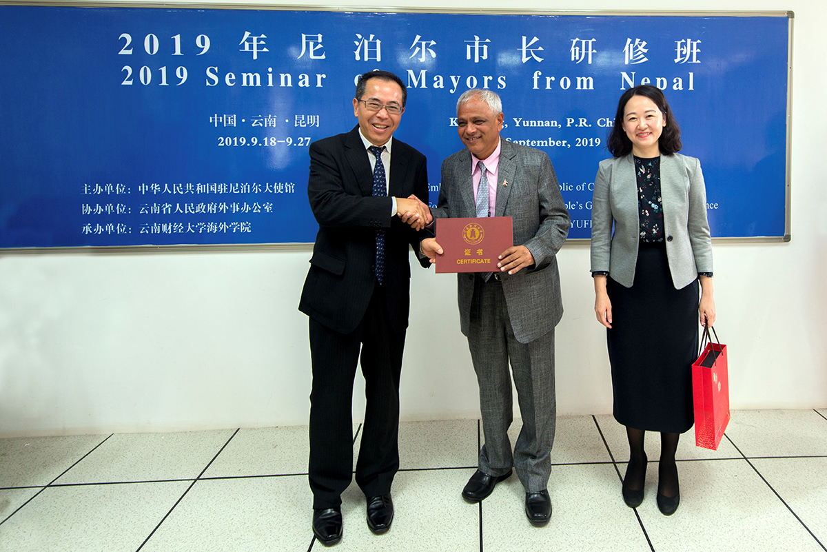 9月26日下午,云南省人民政府外事办公室副主任杨沐、beat365副校长殷红参加研修班结业典礼。杨沐副主任对尼泊尔市长研修班结业表示祝贺,希望各位市长在本次培训班结束后带着中国人民的美好情谊返程,将在中国所见所学用于尼方经济社会建设,助力尼方实现“繁荣尼泊尔,幸福尼泊尔人”的发展目标,共同推动中尼命运共同体建设。殷红副校长在致辞中也对市长们到beat365英国官方网站交流学习表示热烈欢迎,希望研修班学员作为中尼文化交流的使者,进一步巩固中尼传统友谊。研修班学员对beat365的课程设计、考察安排和热情接待给予了高度评价。