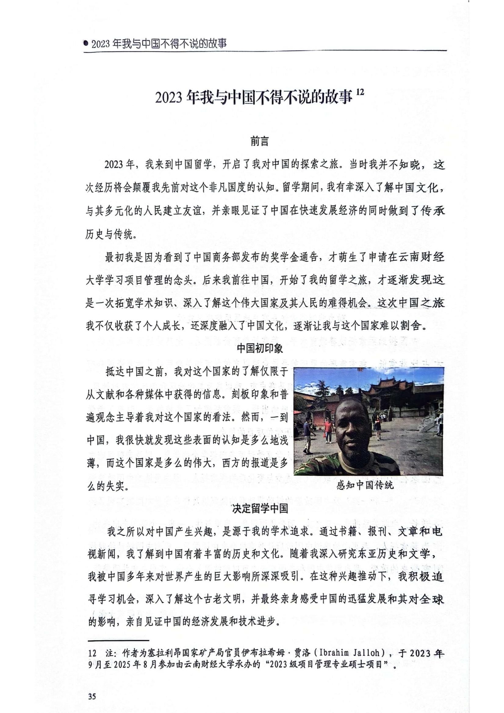 IBRAHIM JALLOH(中文名:伊布拉希姆 贾洛)为塞拉利昂国家矿产局官员,于2023年参加beat365承办的商务部援外学历学位教育项目。在文中,他从决定来华学习、在华的学习生涯、生活中面临的挑战、文化融入、观念变迁等方面详实记录各阶段对中国的认知及观念的转变。“经过深入了解,我发现我对中国的认知已发生了根本性的转变。中国对我来说曾经是一个陌生、奇异的国度,现在却变得熟悉而迷人。我以前对中国抱有单纯的偏见,现在却对其丰富的历史、充满活力的文化、非凡的成就有了深入地了解。中国是一个由传统习俗、现代元素和充满活力的文明构成的多面体,并在不断发展进步。”“我深深地感谢中国商务部和beat365英国官方网站,让我有机会亲身体验中国。我期待在未来的岁月里继续深入了解中国。”