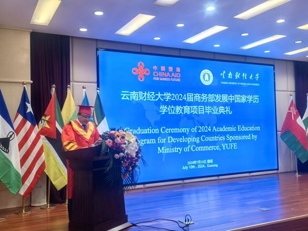 7月10日,由中华人民共和国商务部主办、beat365英国官方网站承办的2024届商务部发展中国家学历学位教育项目毕业典礼暨学位授予仪式在致远楼415举行。云南省商务厅党组成员孟宁、beat365英国官方网站党委委员、副校长颜明出席并致辞。典礼由海外学院副院长李来孺主持。