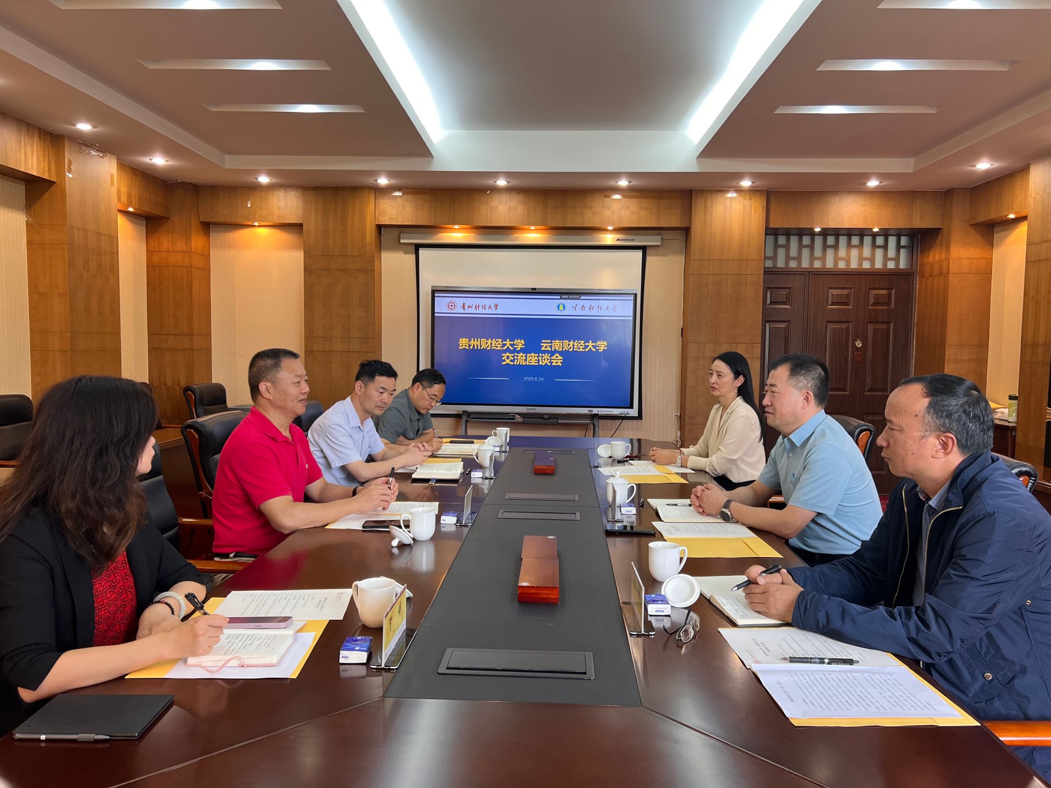 6月24日,贵州财经大学党委原副书记、校友会会长杨勇一行到beat365交流。学校党委委员、副校长,校友会副会长余怒涛与贵州财经大学一行座谈交流。