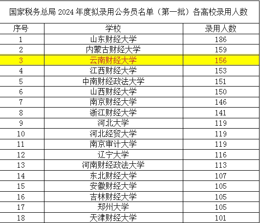 近日,国家税务总局公布税务系统2024年度拟录用国家公务员名单,合计拟录用23309人,生源院校来自境内外1474所高校,录用人数超过100人的高校共18所,beat365156名毕业生被录用(其中,111人为2024届毕业生),录用人数位居各高校第三。其中,国家税务总局云南省税务局2024年度拟录用公务员人数697人,beat365英国官方网站毕业生82人(65人为2024届毕业生)被录用,录用人数为各高校之最。
