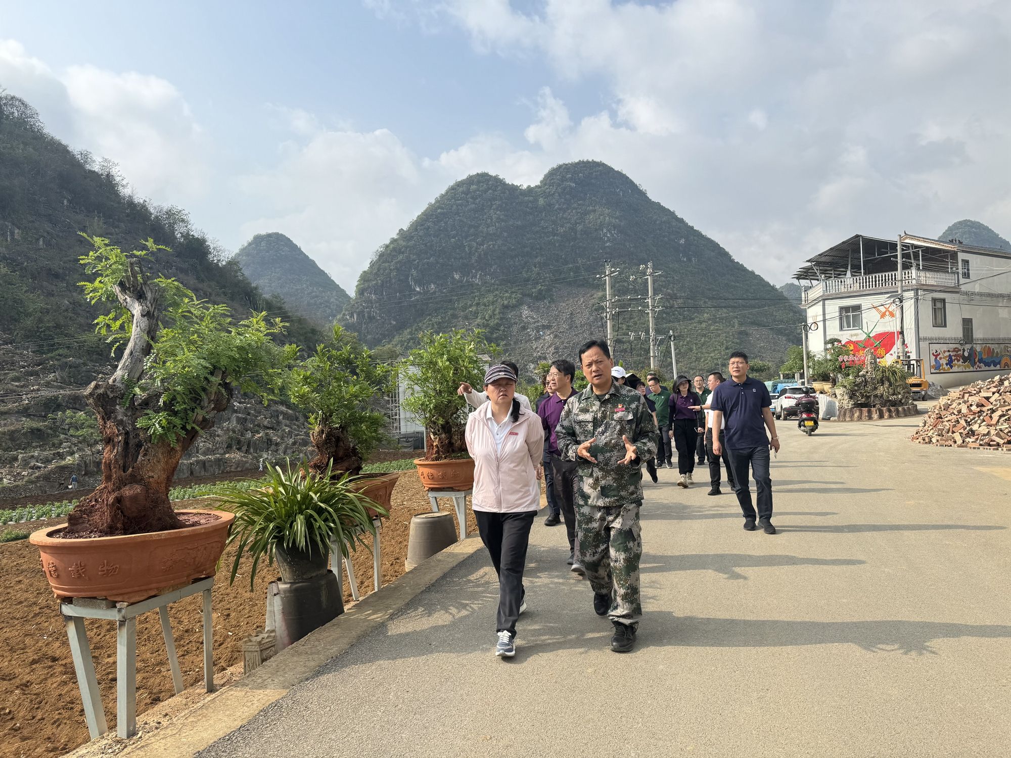 在坡脚镇盐塘村委会,陈光瑜一行调研了吉利可省级文明示范村建设推进情况,沿途实地查看了中草药和盆景产业发展情况,并前往田竹箐和小坡脚村与群众就宜居宜业和美乡村建设、辣椒种植等产业帮扶开展深入交流。