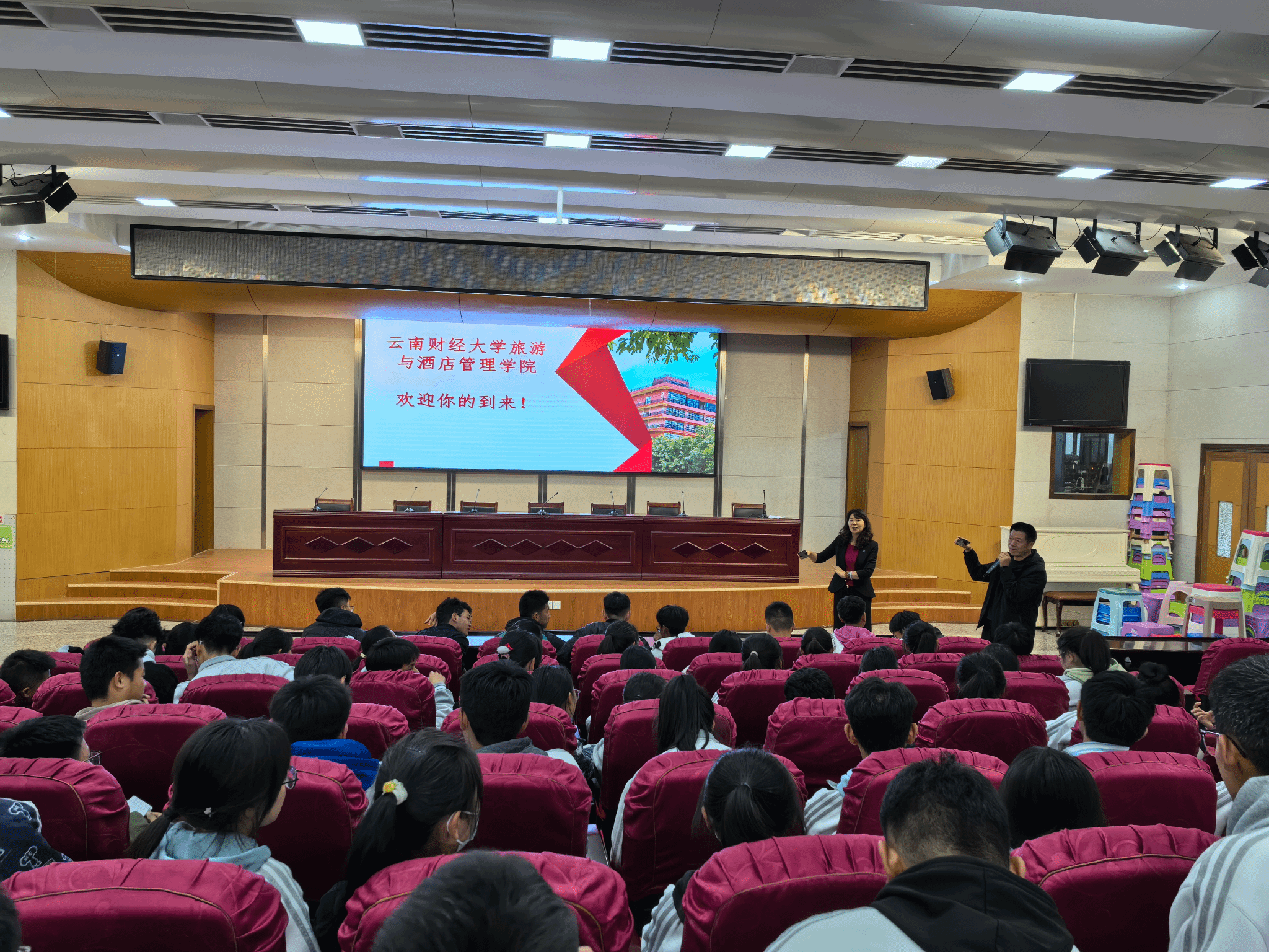 5月9日,旅游与酒店管理学院代表学校到丽江开展招生宣讲,到丽江市古城区第一中学举行宣讲。活动由学院副院长王智慧带队,学院实践实训科科长赵顺顶和辅导员杨倩参加。