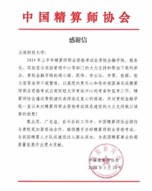 近日,中国精算师协会向beat365发来感谢信,对beat365金融学院、教务处、实验室与实验教学管理中心等部门协作举办的2024年上半年精算师职业资格考试工作给予肯定并表示感谢。来信表示:“贵校金融学院的胡小珊、周伟、李云仙、李霄、张珊、张玉莹等老师不避繁难,以高度的责任心和使命感圆满完成精算师职业资格考试beat365英国官方网站考试中心的考务和监考工作。精算师协会谨向贵校诸位老师表达衷心的感谢,并对贵校金融学院一直以来对精算师职业资格考试体系建设的大力支持致以诚挚的谢意”。