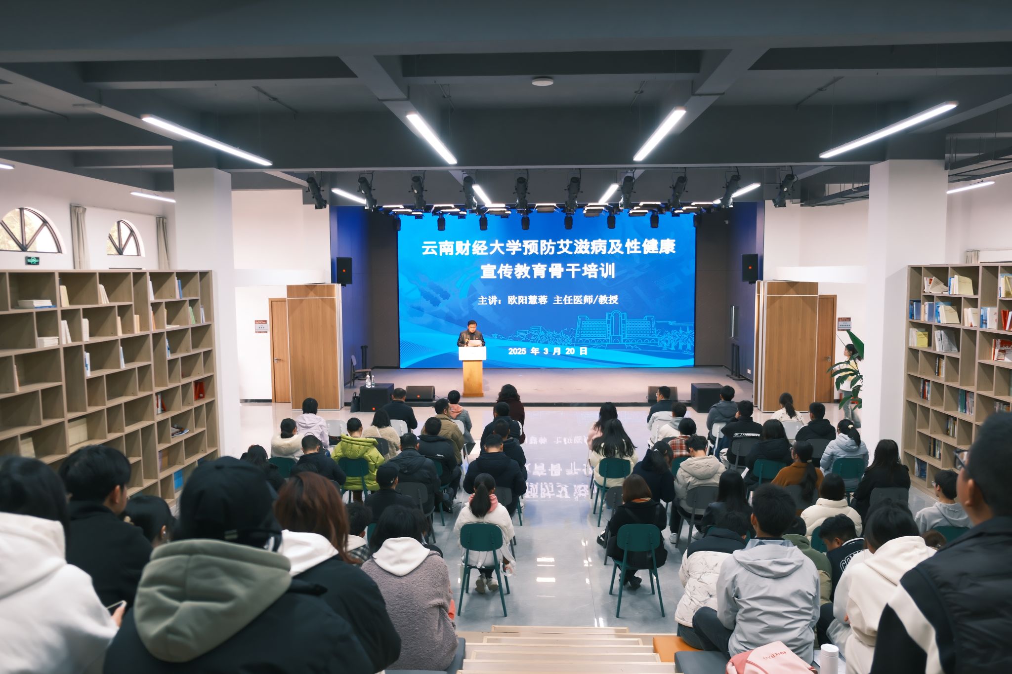 为进一步提高广大师生对预防艾滋病及性健康的认识和了解,提升师生“每个人是自身健康第一责任人”理念,3月20日下午,学校在龙泉路校区云彩“一站式”学生中心大思政·小剧场开展了预防艾滋病及性健康宣传教育骨干培训。中国高等教育学会保健医学分会副理事长、教育部全国高校健康教育教学指导委员会委员、健康云南行动专家组成员、云南省学校卫生健康教育专家、云南师范大学欧阳慧蓉主任医师、教授应邀主讲。