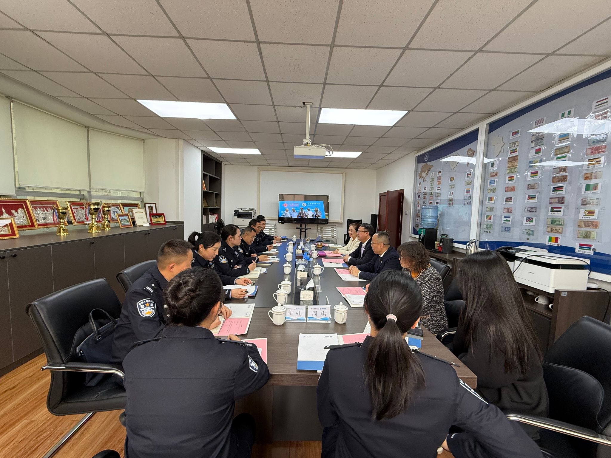 国家移民管理局常备力量第二总队训练处涉外警务战训队、办公室相关负责人,学校对外合作交流处处长、海外学院院长余泳、海外学院副院长李来孺等参加座谈。