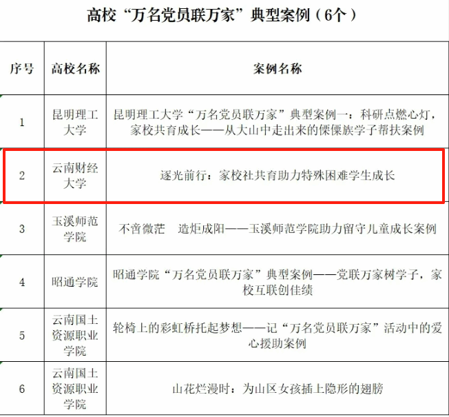 近日,中共云南省委教育工委、云南省教育厅组织开展大中小学“万名党员联万家”活动,活动遴选出6个全省高校“万名党员联万家”活动典型案例,beat365统计与数学学院“逐光前行,家校社共育助力特殊困难学生成长”案例入选。