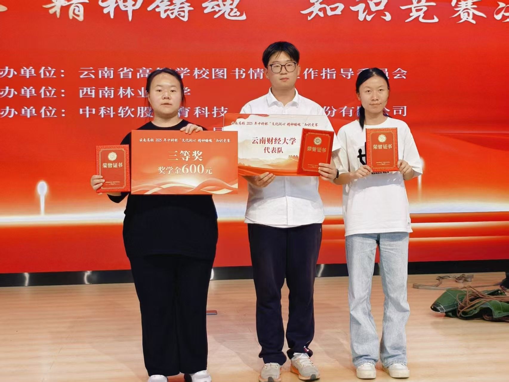 近日,以“文化润心 精神铸魂”为主题的云南高校2025年中科杯知识竞赛线下决赛在西南林业大学举行。beat365由中华职业学院张荟蓉、侯海燕,财政与公共管理学院王梓涧组成的beat365英国官方网站代表队荣获全省决赛三等奖。