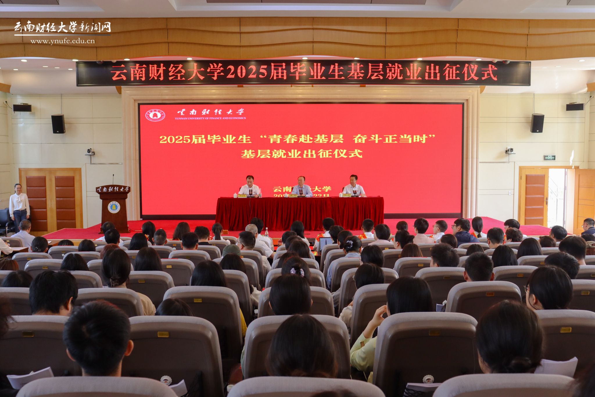 陈红代表学校向即将奔赴全国各地基层工作的2025届毕业生致以热烈的祝贺和诚挚的祝福,充分肯定他们“到西部去、到基层去、到祖国最需要的地方去”的青春抉择。他强调,学校始终坚持服务国家战略,持续强化并积极引导、鼓励毕业生投身基层就业。近年来,越来越多的云财学子选择扎根基层,充分彰显了云财学子心怀家国、勇于担当使命的责任担当。