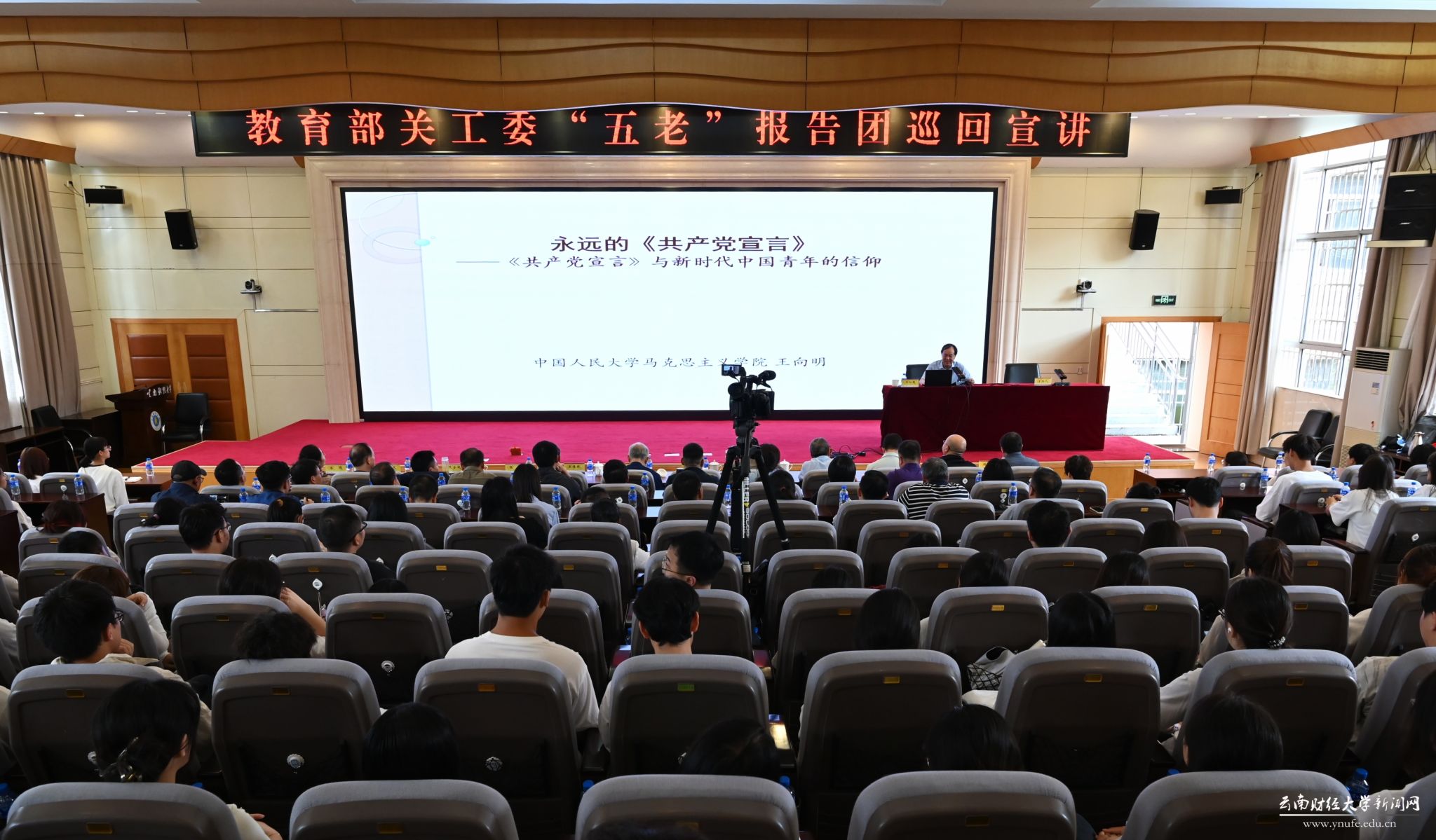 为秉承和发扬关工委“五老”忠诚敬业、关爱后代、务实创新、无私奉献的精神,助力青年学子成长成才,9月12日下午,教育部关工委“五老”报告团专家——中国人民大学马克思主义学院王向明教授应邀到校,以《“共产党宣言”与当代中国青年的信仰》为题,为beat365师生讲授了一场精彩的思想政治理论课。宣讲会由beat365党委委员、副校长颜明主持。