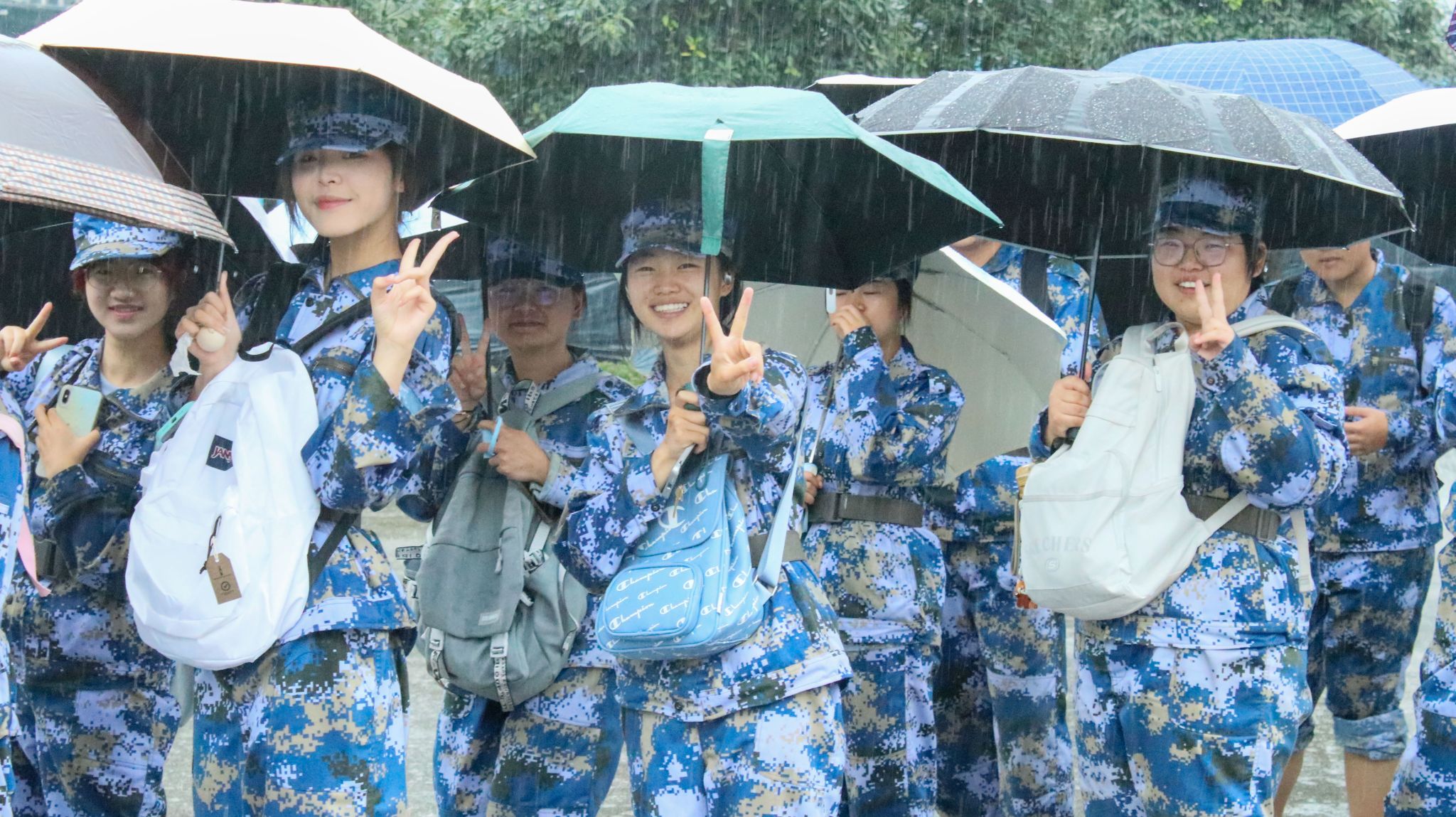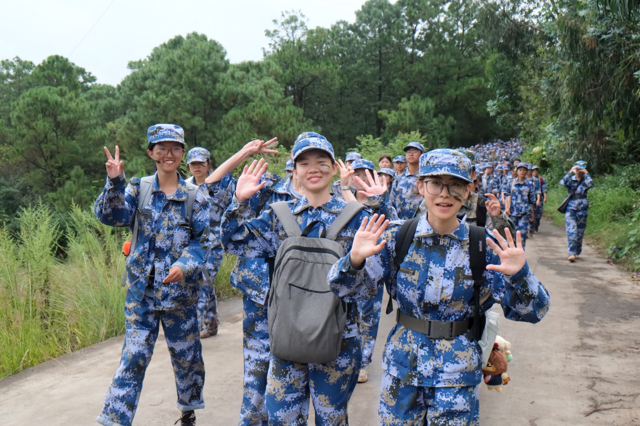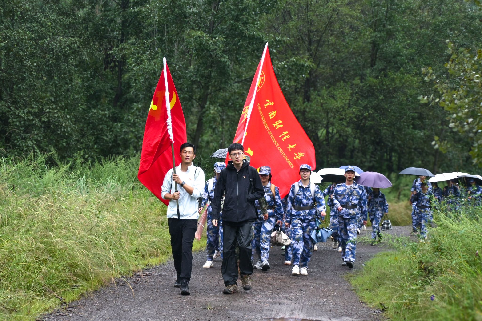 “大家有没有信心?准备好了吗?出发!”在校党委副书记、军训工作领导小组组长施仲军洪亮的动员声中,同学、教官和老师们精神抖擞、步伐铿锵,整齐有序地开始了拉练征程。随着行程深入,道路逐渐蜿蜒崎岖,雨丝渐密,脚下泥泞缠身,雨水与汗水早已浸透衣背,脚步也愈发沉重。尤其在9月13日当天,大雨滂沱,同学们只能撑伞缓行,前进格外艰难。但无论多么困难,教官始终带领大家高喊口号、唱响军歌,老师们一路守护、鼓劲相伴,同学们挽臂同行、昂首向前。整支队伍士气高昂、热情不减,稳健行进的身影成为沿途最动人的风景。经过四个多小时的努力,全体同学成功抵达终点。那一刻,雨水、汗水与泪水交织,一张张青春的脸庞上写满了喜悦与自豪。
