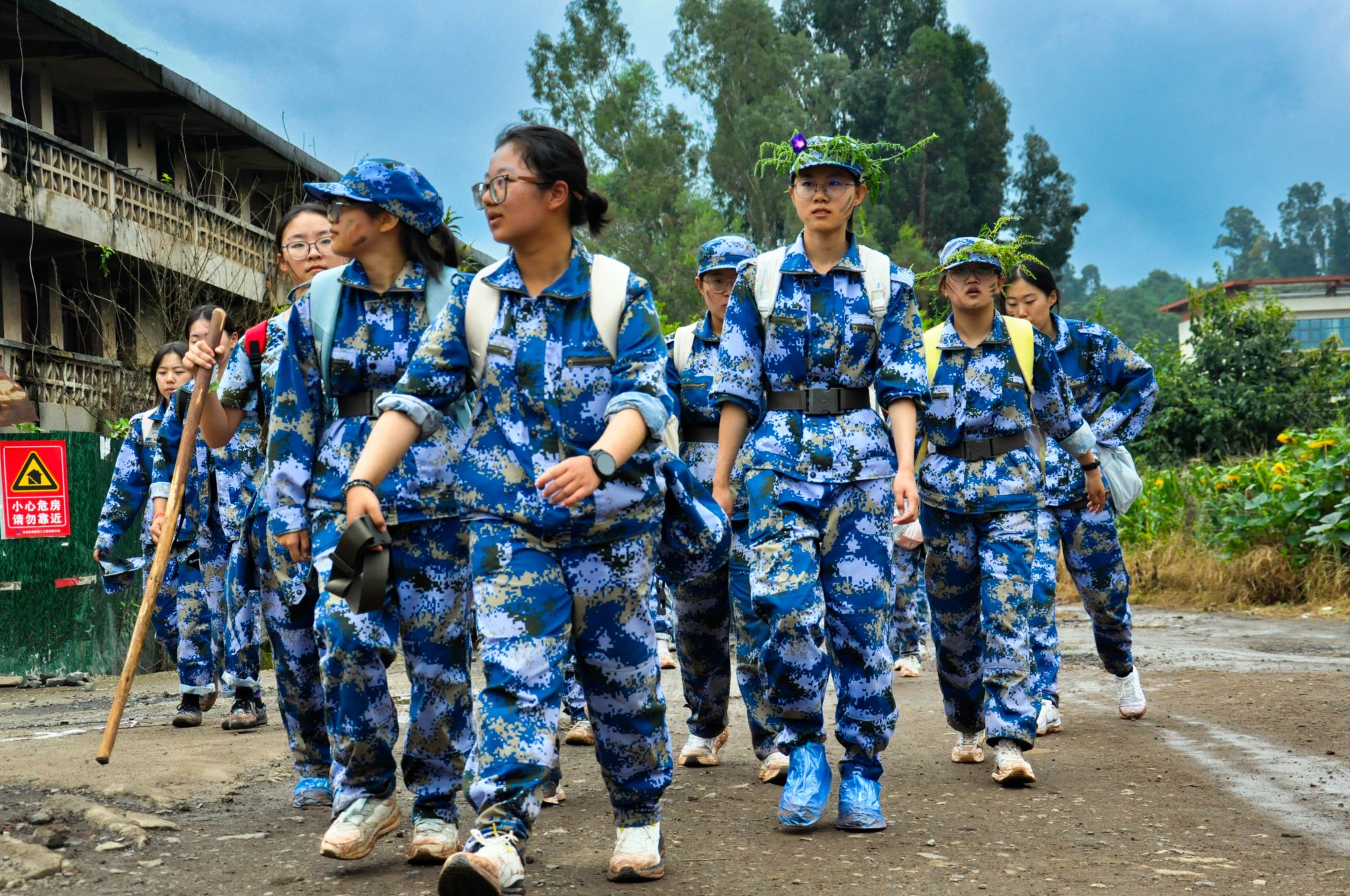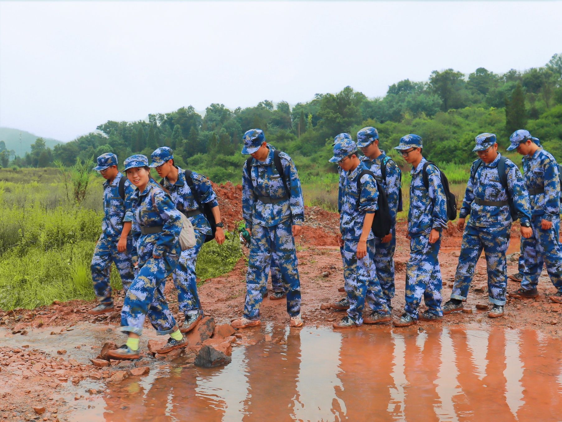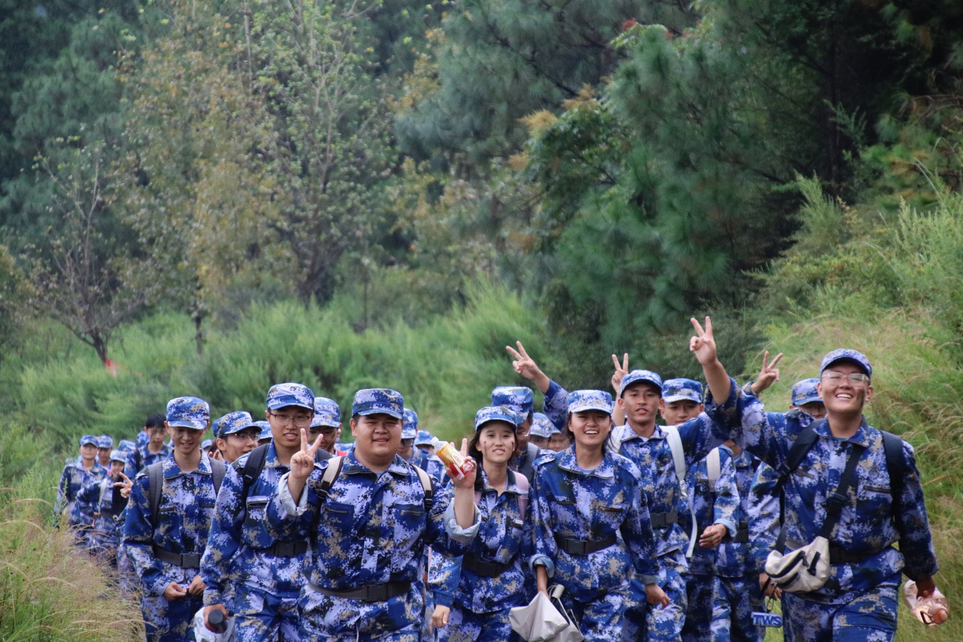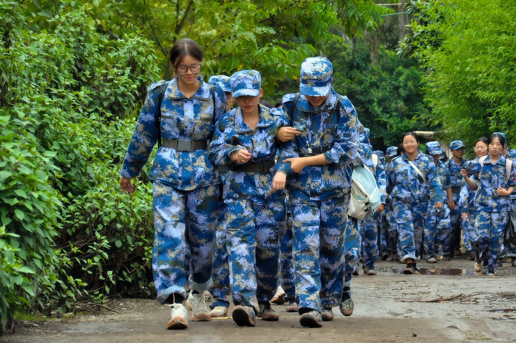 “大家有没有信心?准备好了吗?出发!”在校党委副书记、军训工作领导小组组长施仲军洪亮的动员声中,同学、教官和老师们精神抖擞、步伐铿锵,整齐有序地开始了拉练征程。随着行程深入,道路逐渐蜿蜒崎岖,雨丝渐密,脚下泥泞缠身,雨水与汗水早已浸透衣背,脚步也愈发沉重。尤其在9月13日当天,大雨滂沱,同学们只能撑伞缓行,前进格外艰难。但无论多么困难,教官始终带领大家高喊口号、唱响军歌,老师们一路守护、鼓劲相伴,同学们挽臂同行、昂首向前。整支队伍士气高昂、热情不减,稳健行进的身影成为沿途最动人的风景。经过四个多小时的努力,全体同学成功抵达终点。那一刻,雨水、汗水与泪水交织,一张张青春的脸庞上写满了喜悦与自豪。