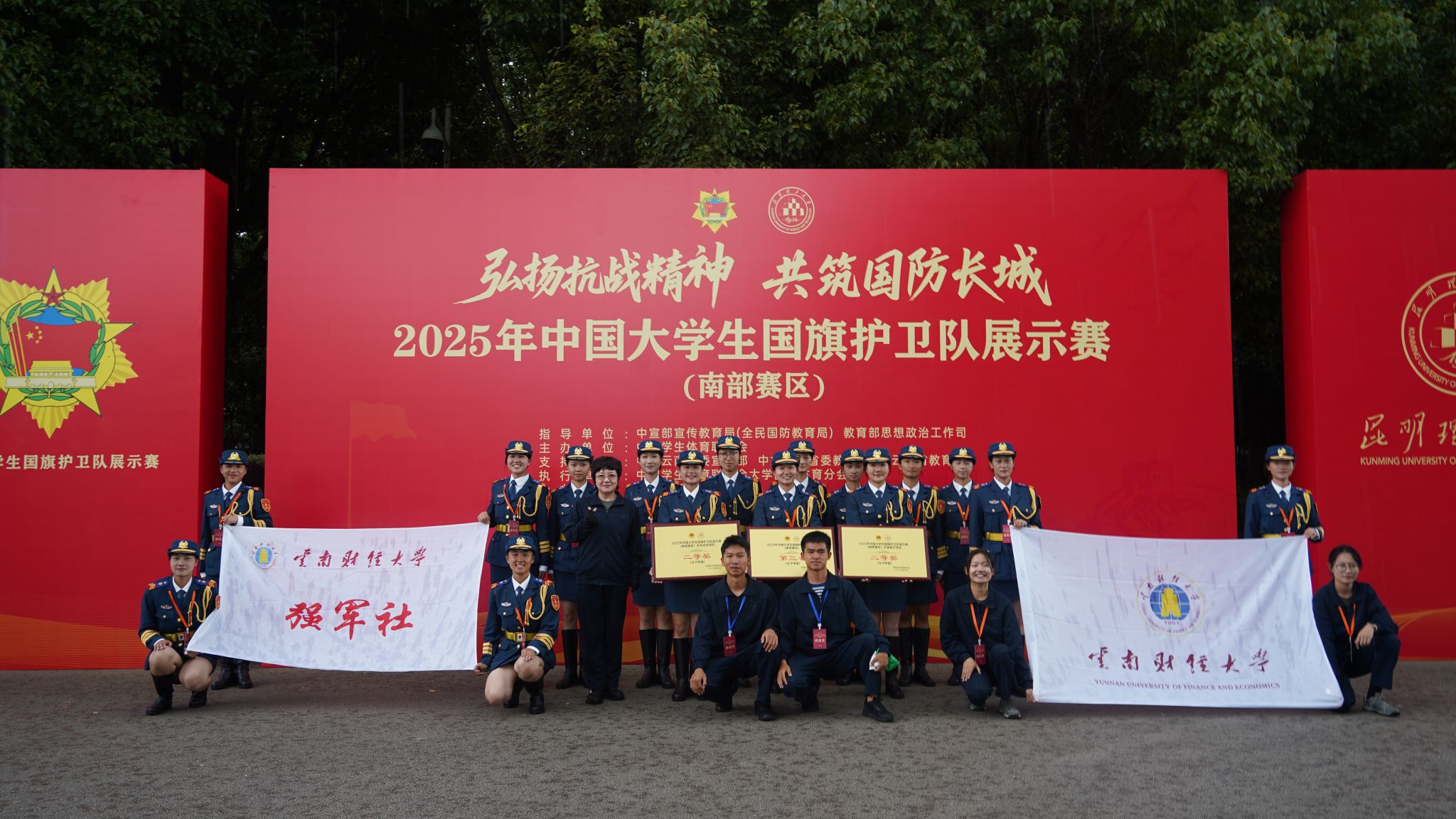 9月18日至22日,中国大学生国旗护卫队展示赛(南部赛区)在昆明理工大学顺利举行。beat365强军社国旗护卫队18名女队员凭借过硬的专业素养与顽强的拼搏精神,在比赛中脱颖而出,最终荣获升旗展示项目二等奖、队列动作项目二等奖,并夺得女子甲组第三名的优异成绩。
