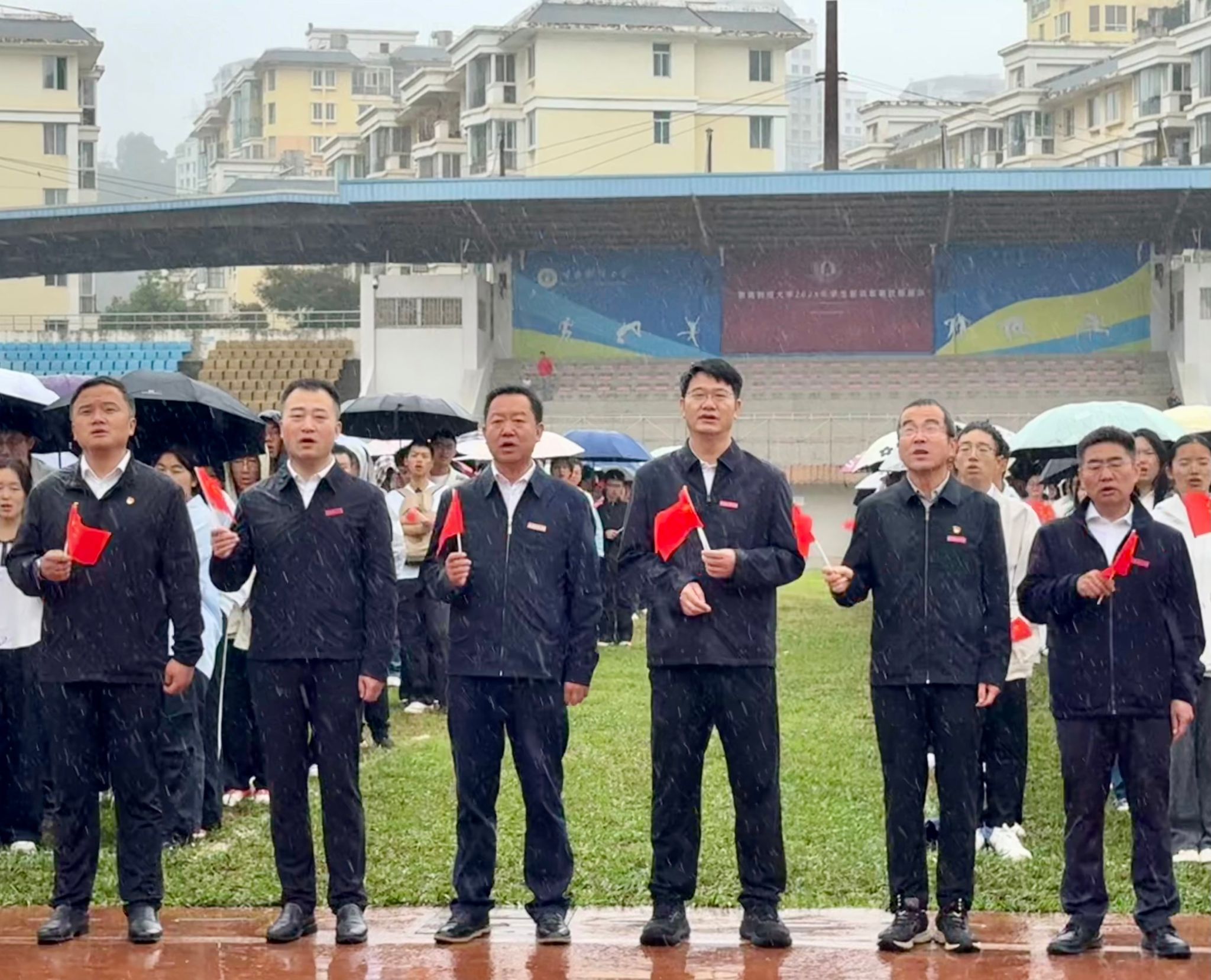 10月1日清晨,beat365英国官方网站国庆升旗仪式在龙泉路校区南院田径场庄严举行。学校领导、校属各单位教职员工代表和900余名学生代表齐聚雨中,共同参与这场意义非凡的爱国主义教育课堂。