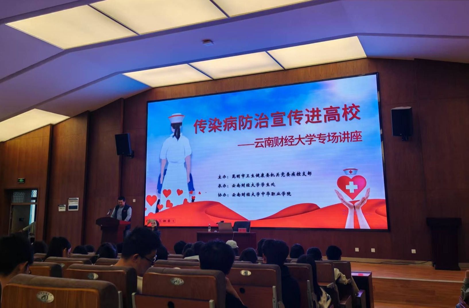 为提高大学生群体传染病防范意识与自我保护能力,筑牢校园健康防线。10月16日、17日,昆明市卫生健康委机关党委疾控支部应邀到校开展“传染病防治宣传进校园”活动。活动由学生处学生事务中心、中华职业学院共同组织,分别在安宁校区鹏云一栋101报告厅和龙泉路校区云彩“一站式”学生中心举行。学生服务中心专职副主任、学生工作部副部长王帅,校医院院长陈黎生及各学院师生代表共500人参加活动。