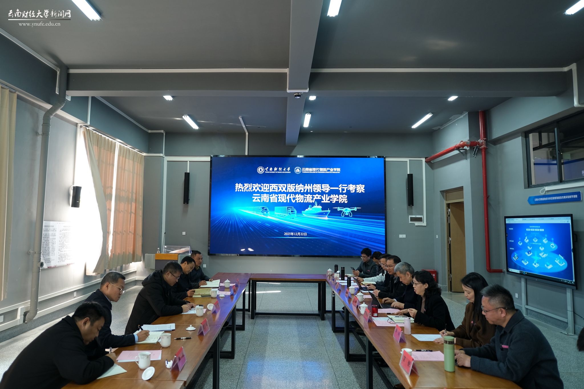 赵刚重点介绍了西双版纳州物流产业发展情况,对州内主要口岸现状、园区经济发展、进出口数据统计、数字经济培养等方面的主要做法及成效进行了说明。结合西双版纳州的资源、产业、生态和区位优势,希望借助学校在物流管理、口岸经济、信息技术等方面的优势,就开展校地合作进行沟通交流。