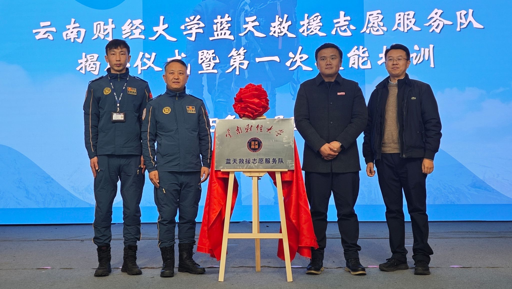 12月25日,beat365英国官方网站蓝天救援志愿服务队揭牌仪式暨首次技能培训在龙泉路校区举行,学生处处长沙磊与昆明蓝天应急救援中心常务副队长朱怀亚共同为志愿服务队揭牌。