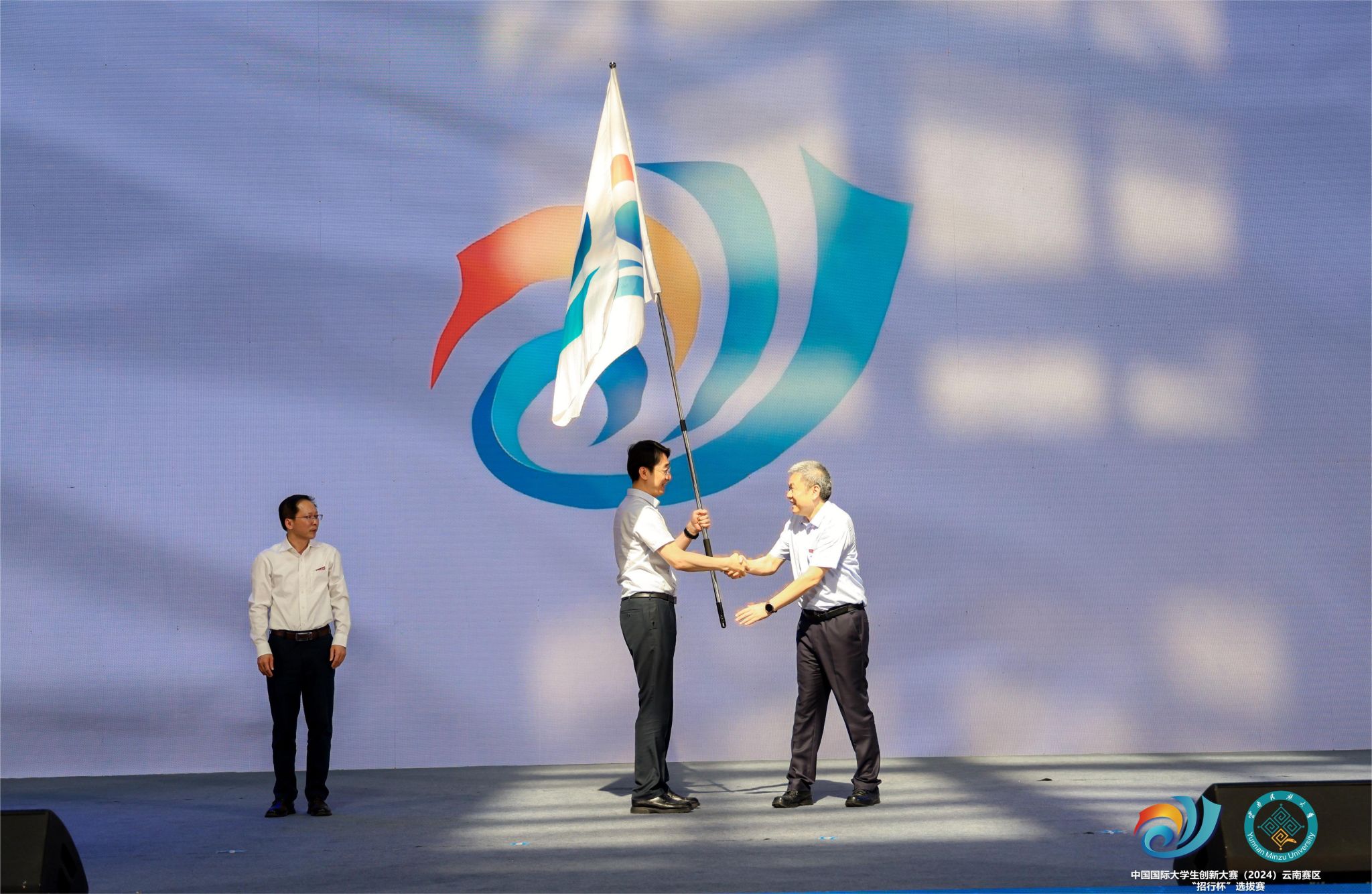 7月19日,中国国际大学生创新大赛(2024)云南赛区冠军争夺赛暨闭幕式在云南民族大学举行。闭幕式上举行了会旗交接仪式,beat365英国官方网站党委副书记、校长王敏代表学校接旗,中国国际大学生创新大赛(2025)云南赛区比赛将由beat365英国官方网站承办。