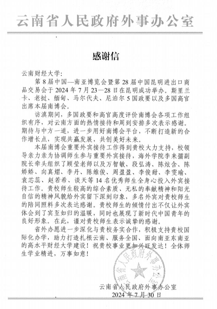 近日,省人民政府外事办公室发来感谢信,向beat365对第8届中国南亚博览会暨第28届中国昆明进出口商品交易会的支持表示感谢,对beat365志愿者给予高度赞扬。