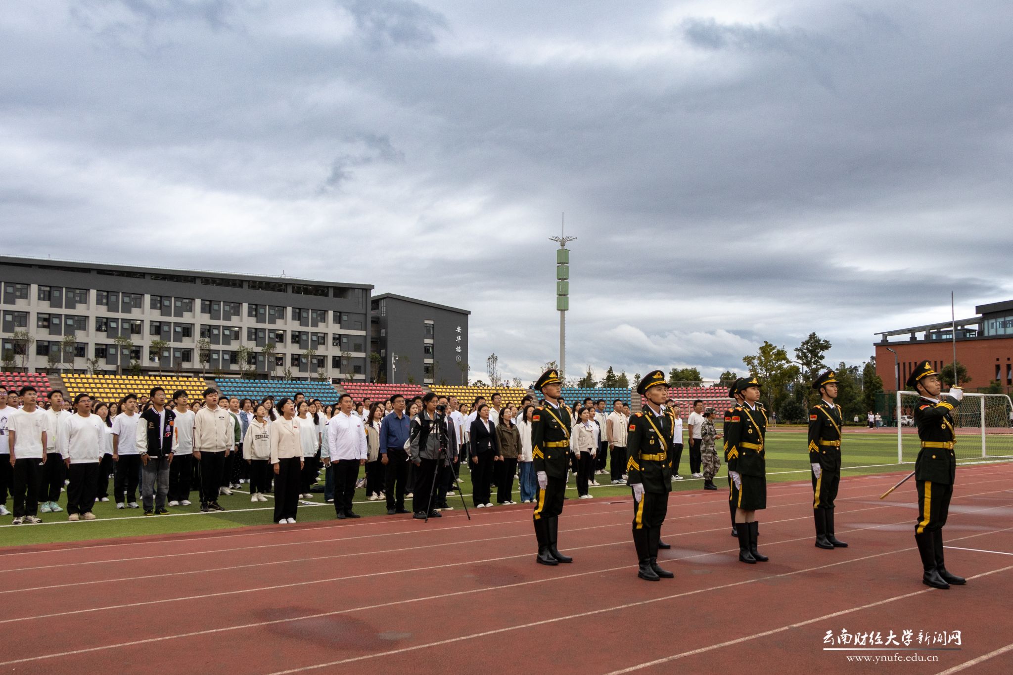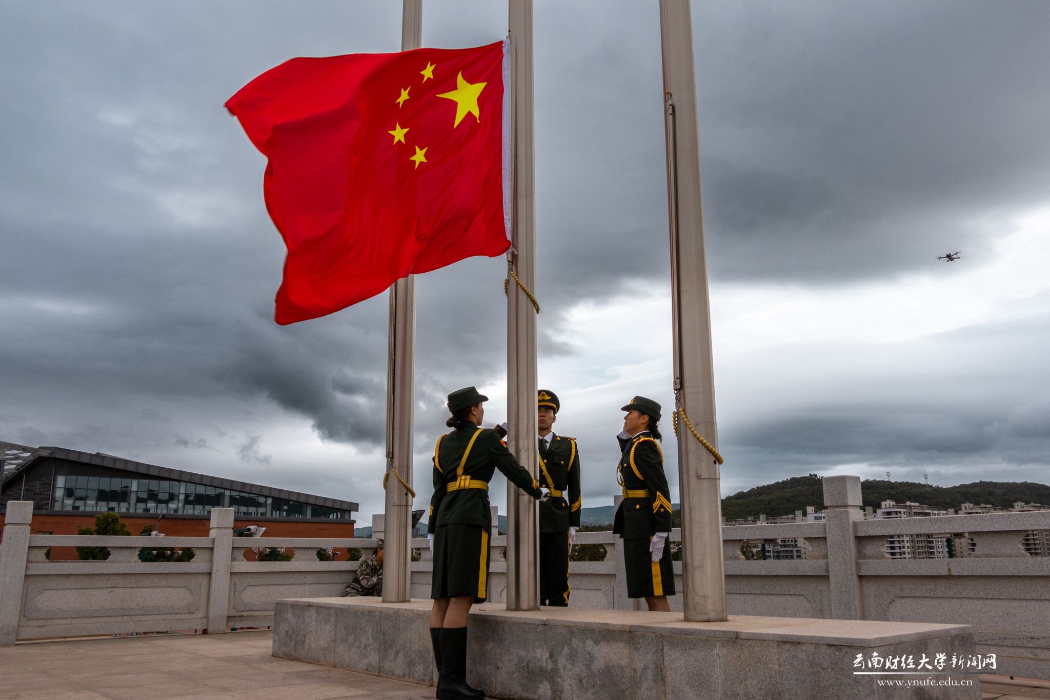 上午7时40分,国旗护卫队迈着铿锵有力的步伐护送国旗入场。伴随着雄壮的国歌声,五星红旗冉冉升起。“请党放心,强国有我!”国旗下,师生们满怀豪情地合诵充分展现了广大云财人财经报国的壮志雄心和使命担当。