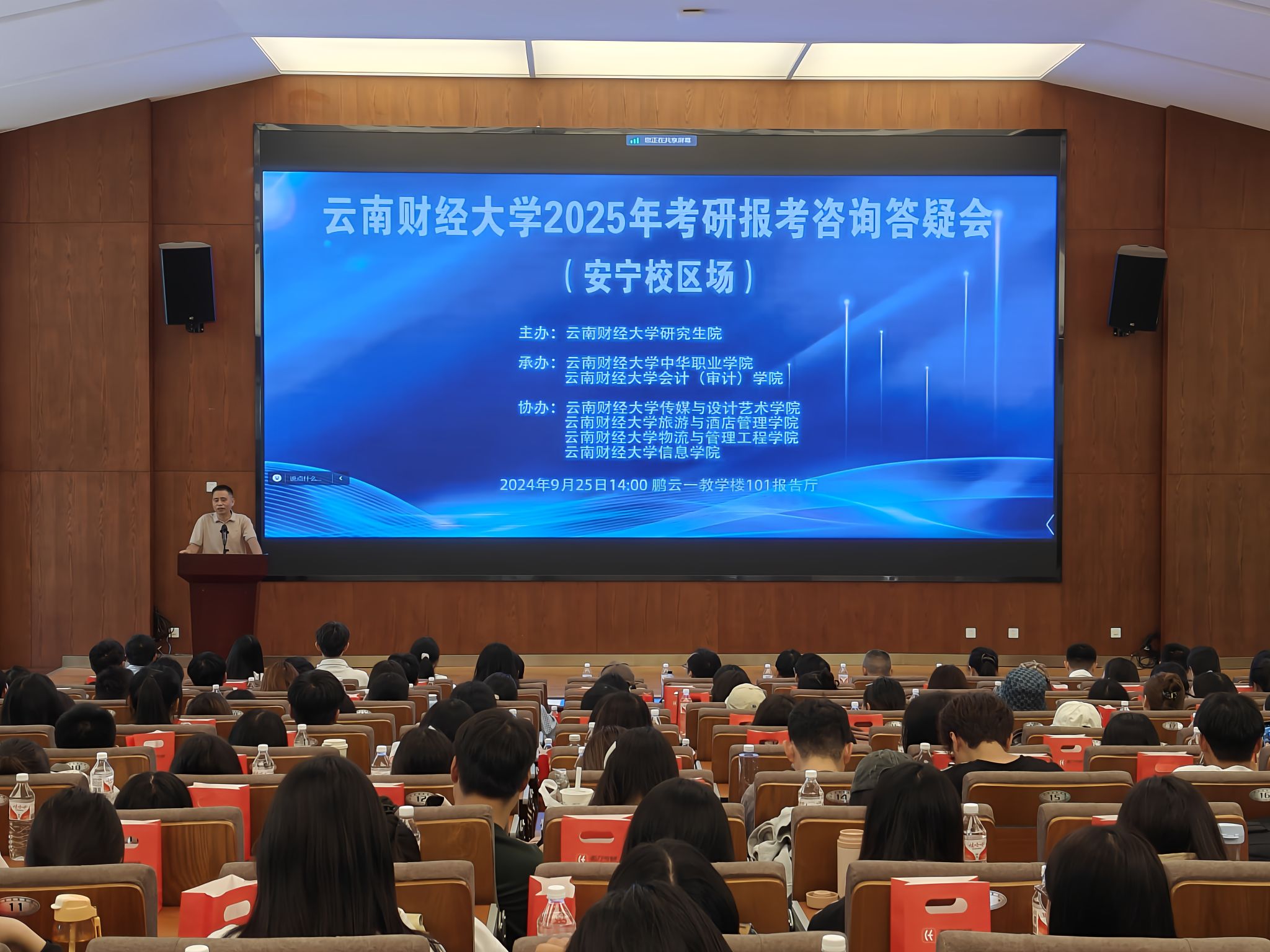 为了全面推进beat365考研工作,营造浓郁积极的考研学习氛围,帮助同学们加深对学习方法、备考策略及报考流程的了解,9月25日,beat365英国官方网站2025年考研报考咨询答疑会(安宁校区场)在安宁校区鹏云一教学楼101报告厅举行。此次活动由研究生院主办,中华职业学院、会计(审计)学院联合承办,传媒与设计艺术学院、旅游与酒店管理学院、物流与管理工程学院、信息学院共同协办。400余名备考本科生参加会议。会议由中华职业学院副院长曾军主持。