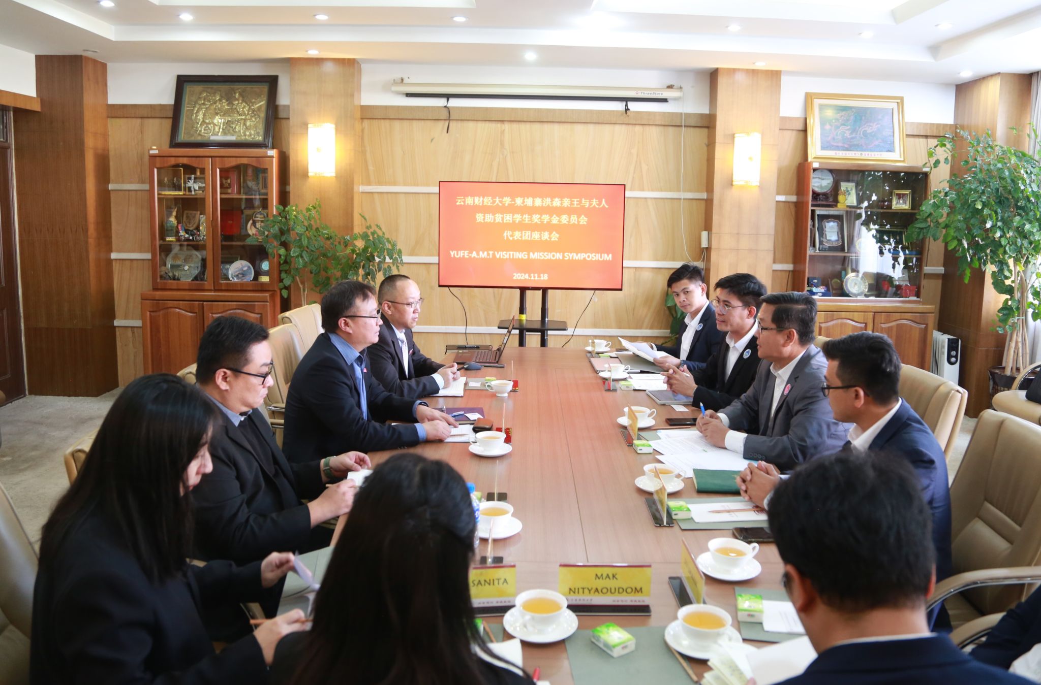 11月18日下午,柬埔寨洪森亲王与夫人资助贫困学生奖学金委员会(A.M.T)副主任H.E.HENG SOTHY一行6人,在柬埔寨王国驻昆明总领事馆领事SIV LIMANN的陪同下到访beat365。校党委委员、副校长颜明会见来宾并举行座谈,对外合作交流处处长、海外学院院长余泳,曼谷商学院执行院长马艺参加座谈。