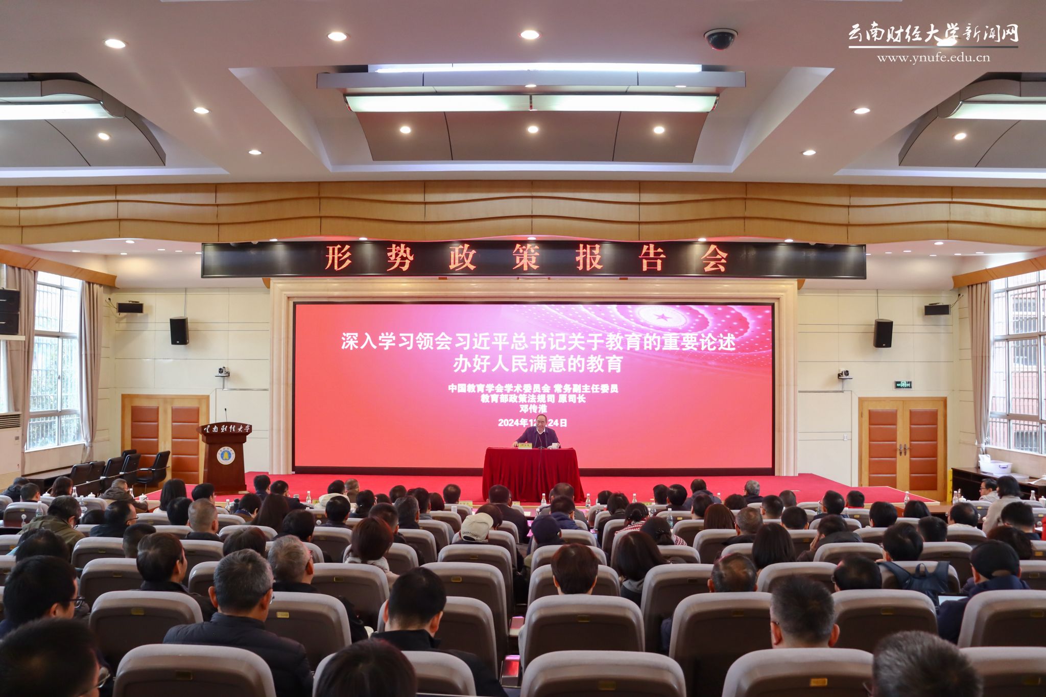 为深入学习贯彻习近平总书记关于教育的重要论述和全国教育大会精神,12月24日上午,学校在国际学术报告厅举行形势政策专题报告会。中国教育学会学术委员会常务副主任委员、教育部政策法规司原司长邓传淮应邀以《学习领会习近平总书记关于教育的重要论述,办好人民满意的教育》为题作报告,校党委副书记施仲军主持报告会。