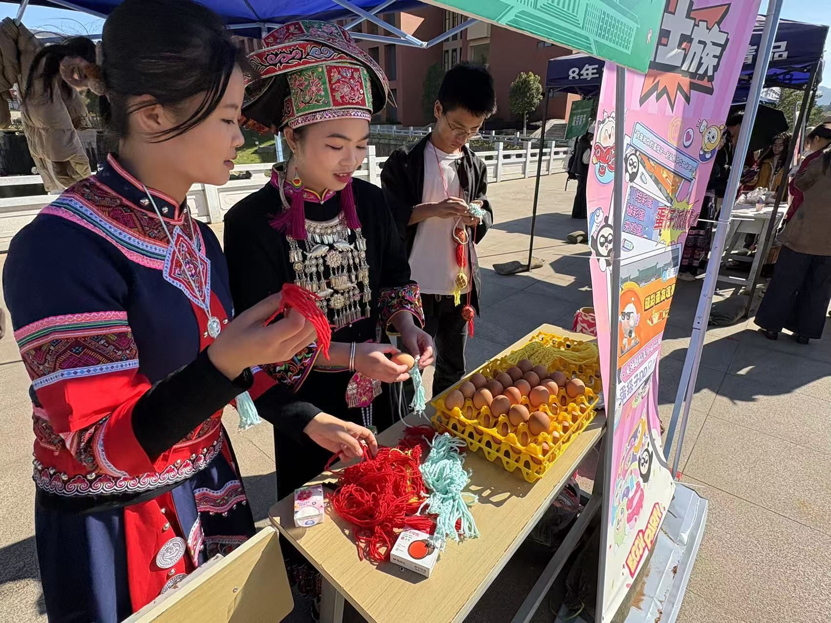 决赛现场,观众们不仅可以欣赏到各民族的传统服饰、手工艺品和美食,还能体验到竹竿舞、音乐表演、泡茶品茶、扎染制作、投壶比赛等特色活动和游戏,深切感受各民族文化的独特魅力。参与活动的师生可以用“小红花”为心仪的队伍投票助力,极大地激发了师生了解少数民族文化的热情。