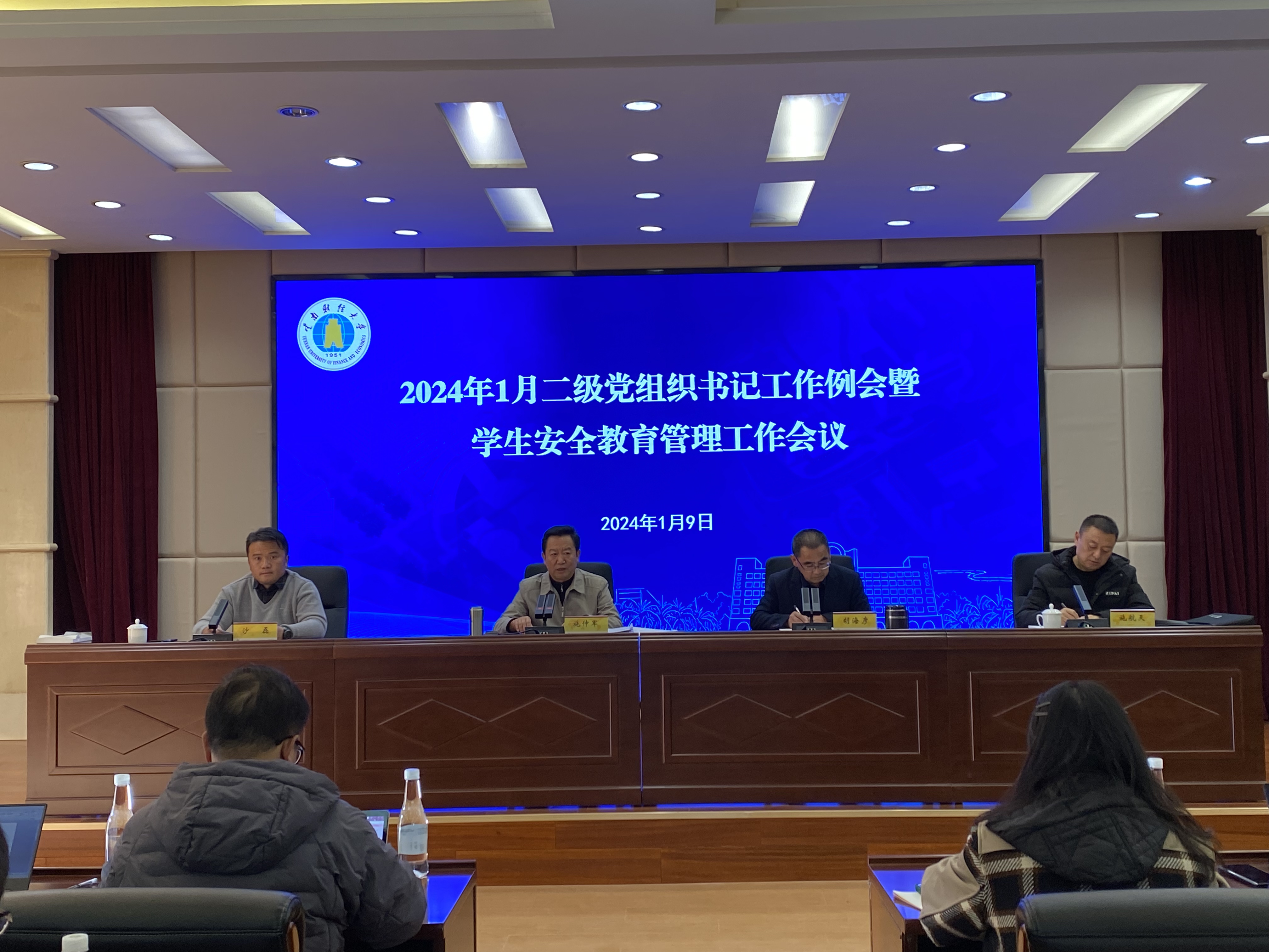 1月9日,学校在龙泉路校区致远楼415会议室召开2024年1月二级党组织书记工作例会暨学生安全教育管理工作会议,传达学习全省学校安全工作视频调度会和省教育厅高校学生安全教育管理工作调度会会议精神,通报近期学校学生安全工作情况,分享交流学生安全教育管理工作经验。校党委副书记施仲军出席会议并讲话,会议由校党委委员、副校长胡海彦主持。