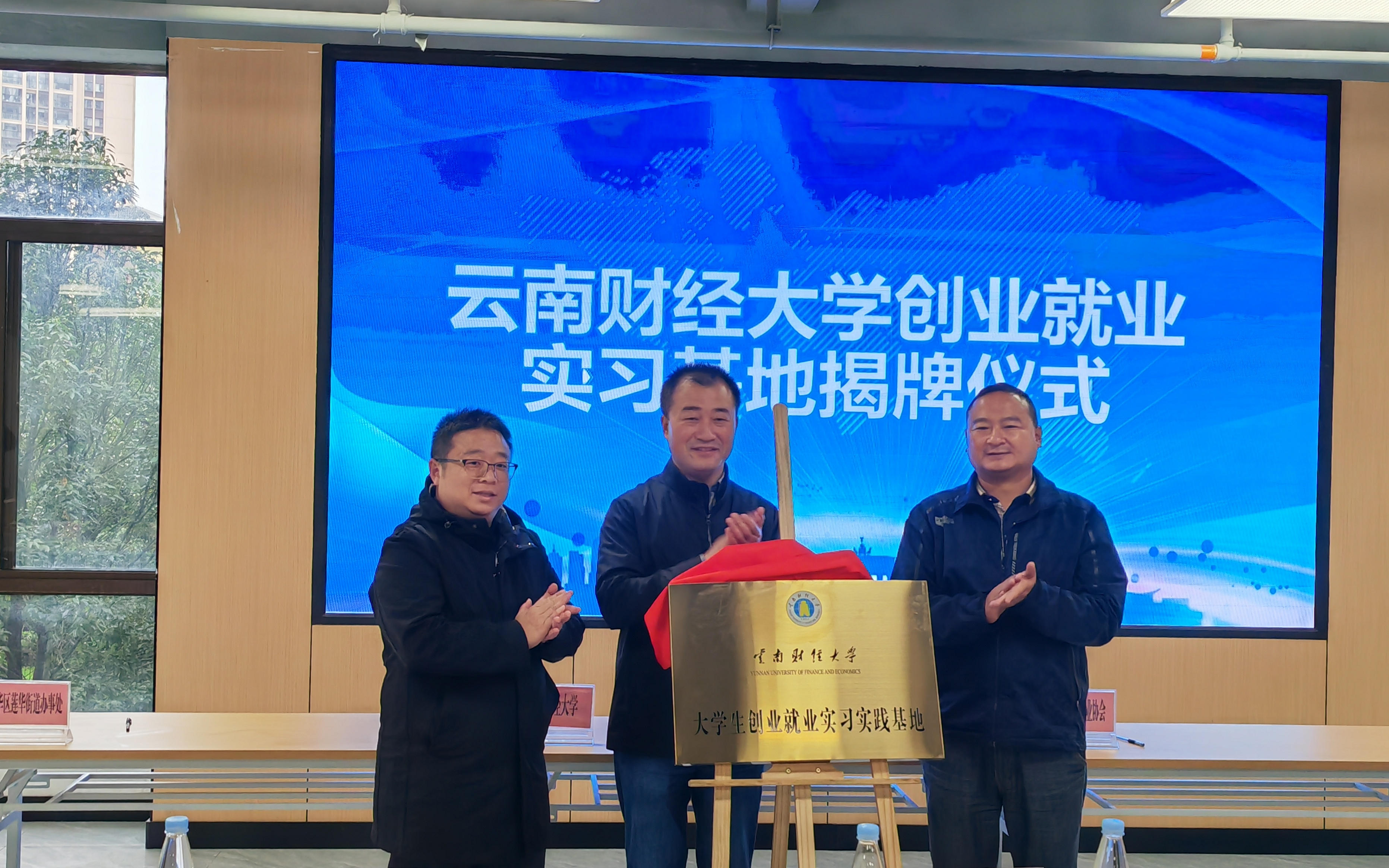 学校副校长余怒涛、云南省青年创业协会会长贺靖、五华区政府莲华街道党工委书记张兴爻共同为beat365英国官方网站青年创业就业实习基地揭牌。学校招生职业发展中心主任霍嘉军、青创实业集团常务副总裁邓成昆、五华区政府莲华街道办事处主任徐加上台签约。
