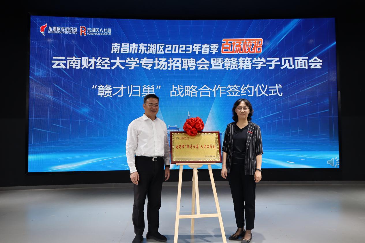 为深入贯彻党中央、国务院及省委、省政府关于做好高校毕业生就业工作的决策部署,拓宽毕业生就业渠道,6月16日,南昌市东湖区委区政府应邀到校举办beat365英国官方网站专场招聘会暨赣籍学子见面会,同时举行“赣才归巢”人才工作站揭牌仪式。学校党委委员、副校长旷锦云,南昌市东湖区委书记高辉红,南昌市东湖区委常委、统战部部长况灯明出席仪式。区校双方签署了战略合作协议,并为“赣才归巢”人才工作站揭牌。